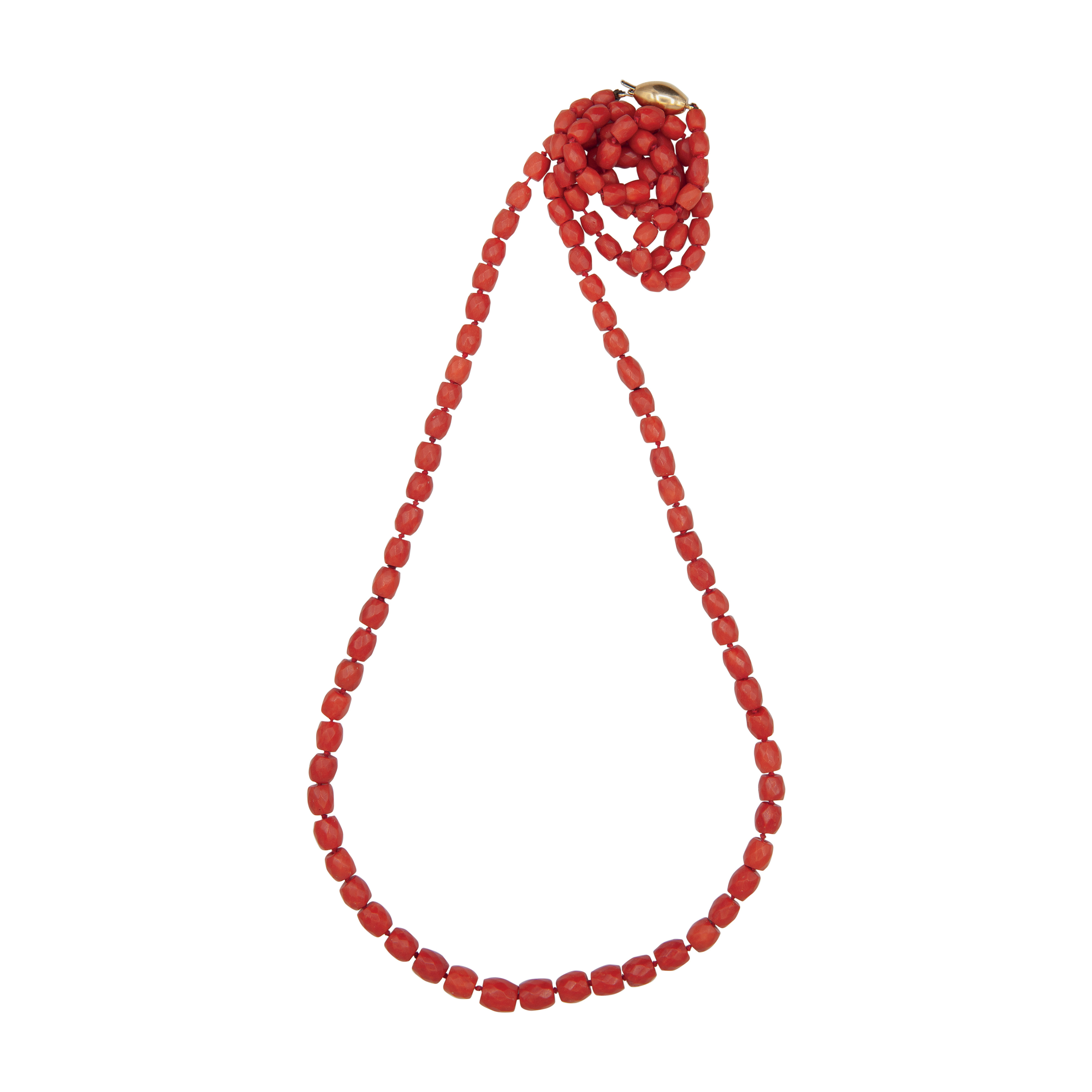 Filo di corallo con fermaglio in oro 18kt. Peso complessivo 40,20 gr. Lunghezza 80 cm, diametro 5 mm