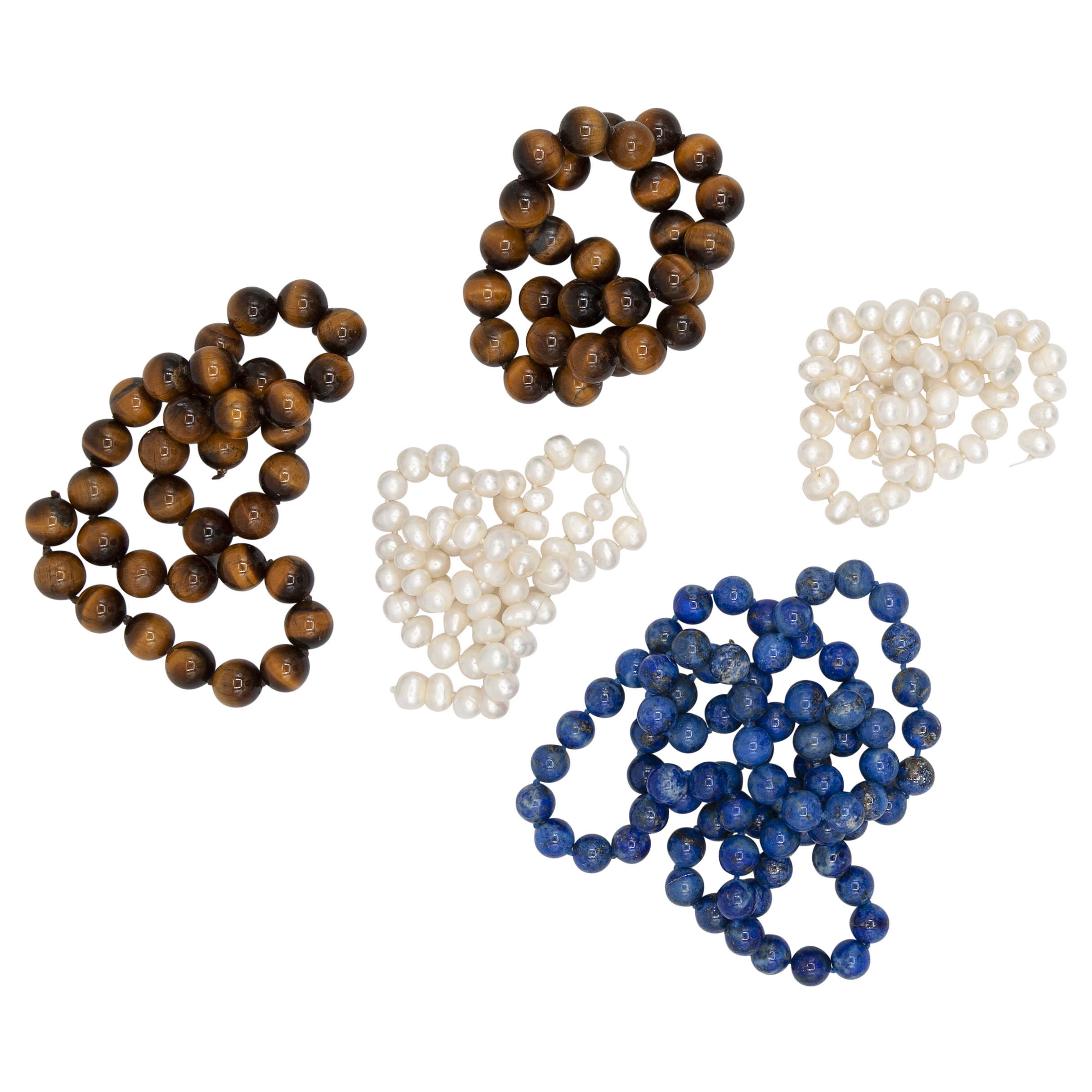 Lotto composto da composto da 1 filo di pietre blu, 2 fili di tigre e 2 fili di perle di fiume. Peso complessivo 368 gr