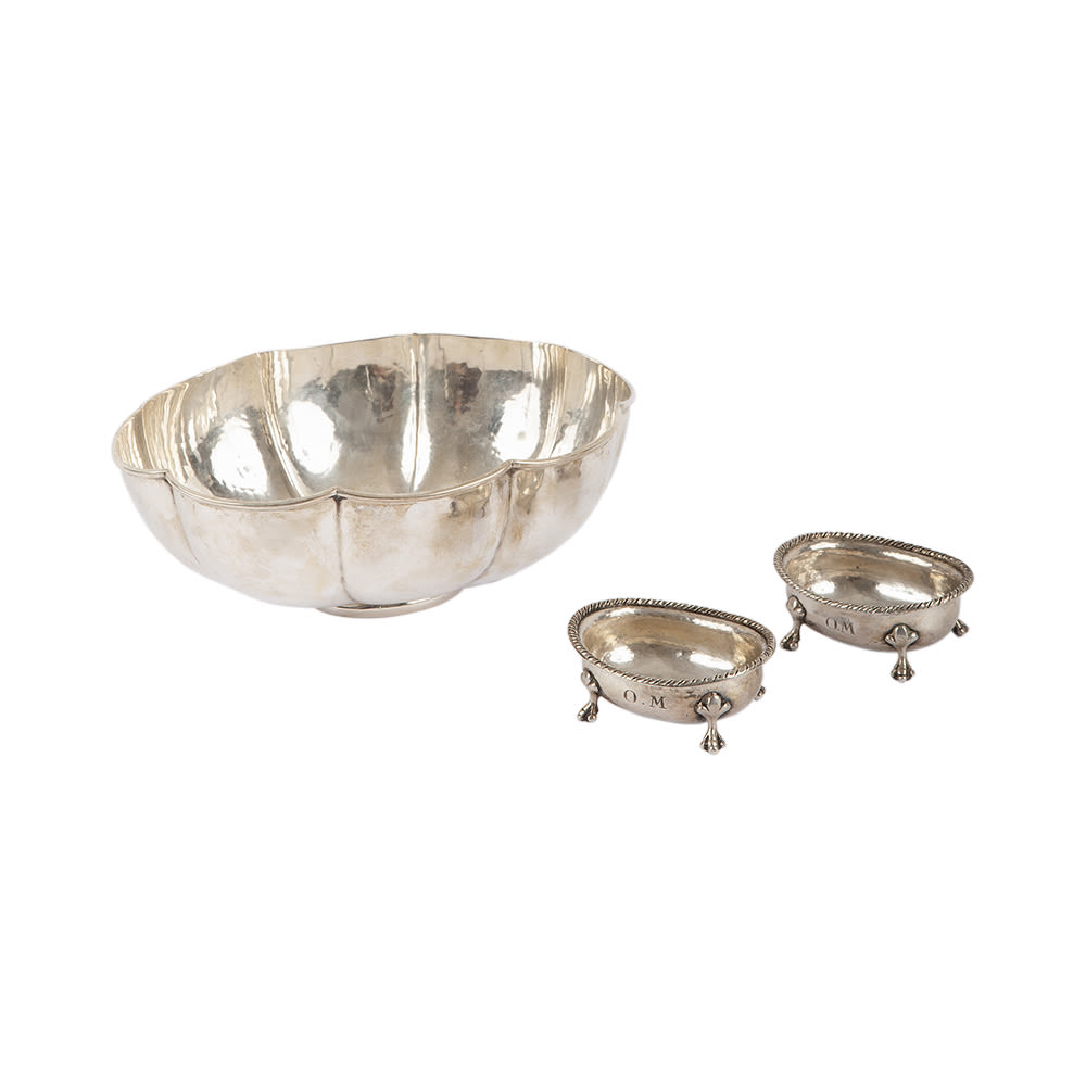 Set di due saliere con 4 piedini e fagiolo firmato Missiaglia, timbri fascio, Argento 800/°°°, gr. 368.