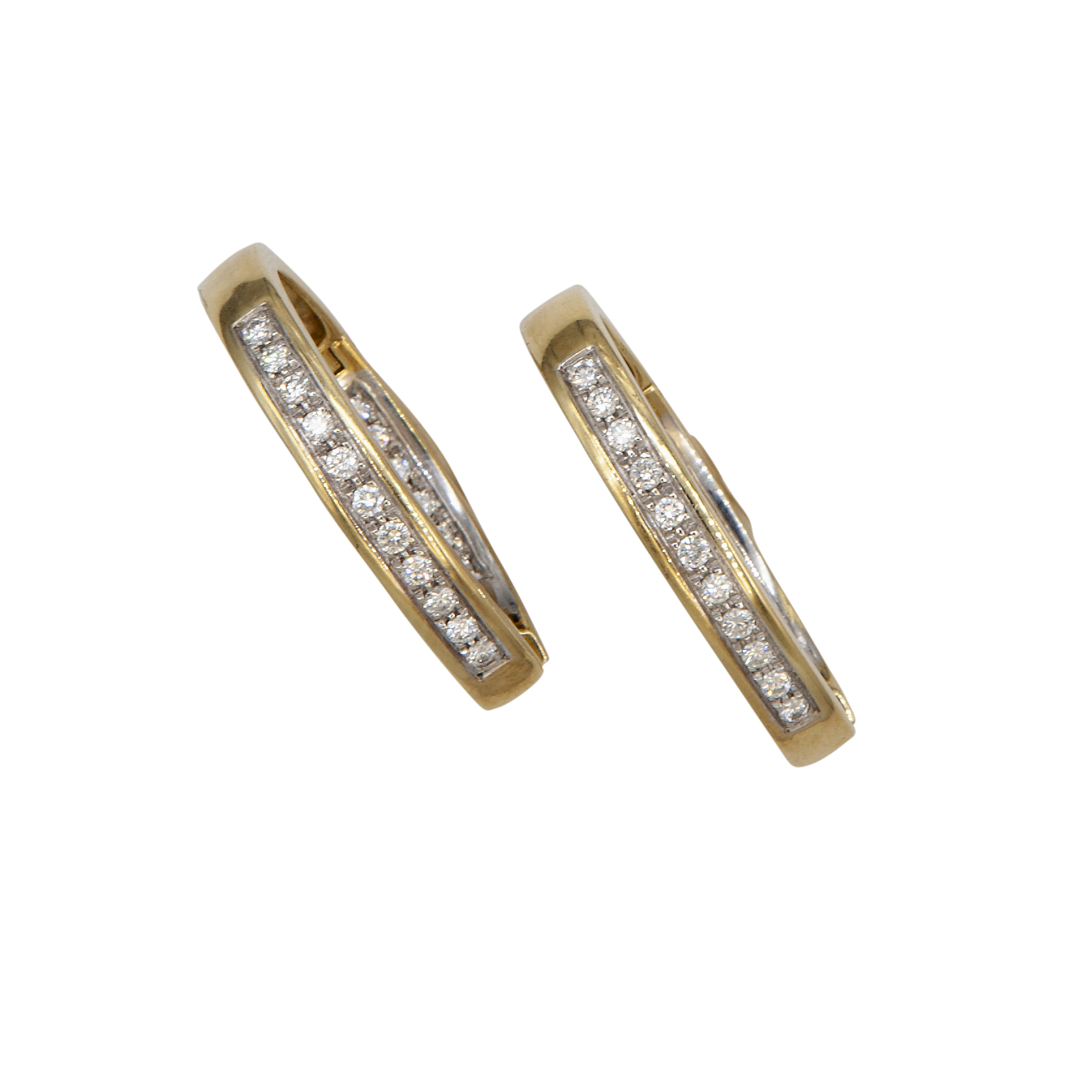Orecchini in oro giallo 18kt a forma di cerchio con diamanti laterali per circa 0,70 ct. Peso complessivo 13,70 gr