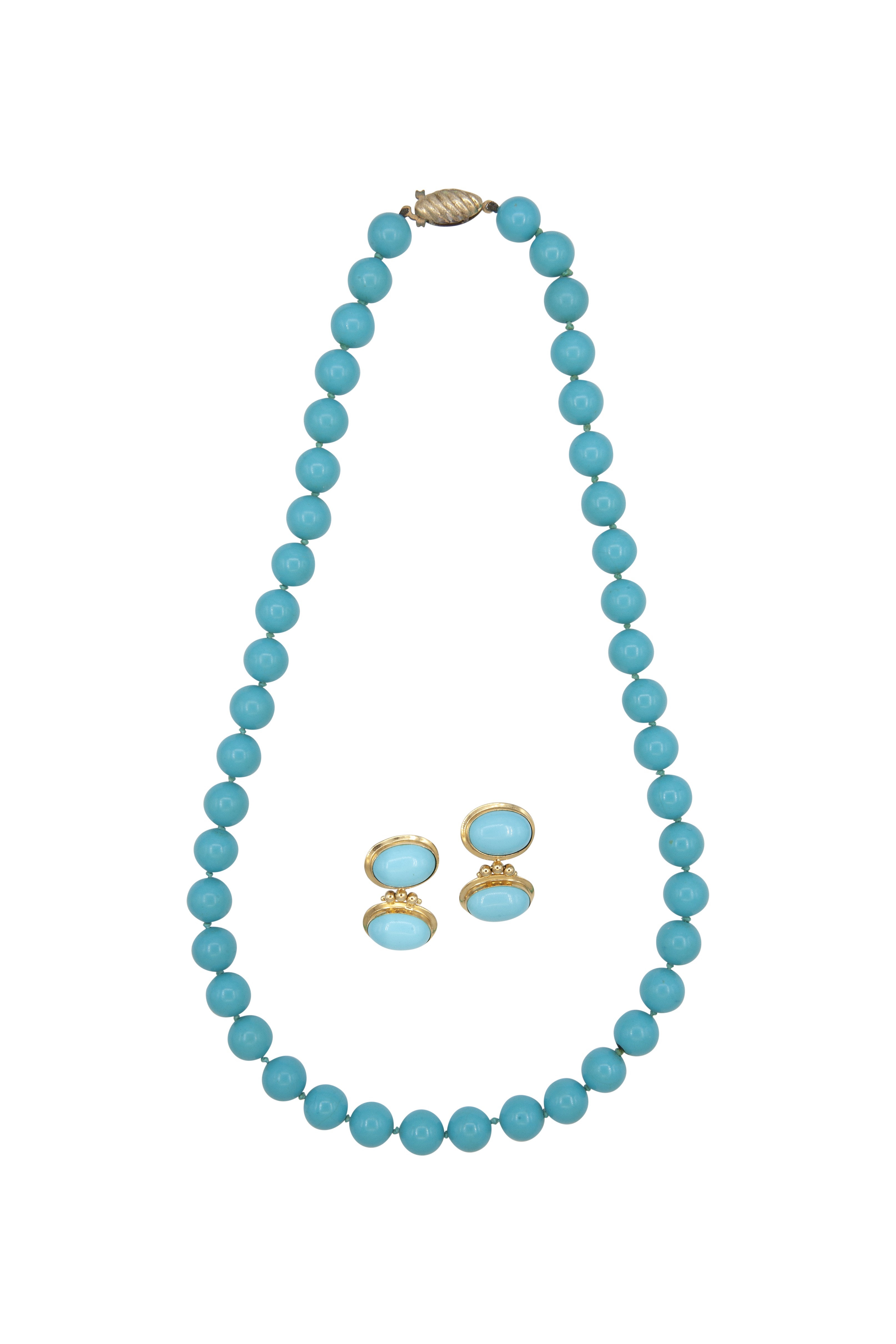 Parure composta da collana e orecchini in pasta di turchese. Lunghezza collana 42 cm, misura orecchini 3 cm.Chiusura e inserti in oro giallo 18kt. Peso complessivo 58,7 gr.