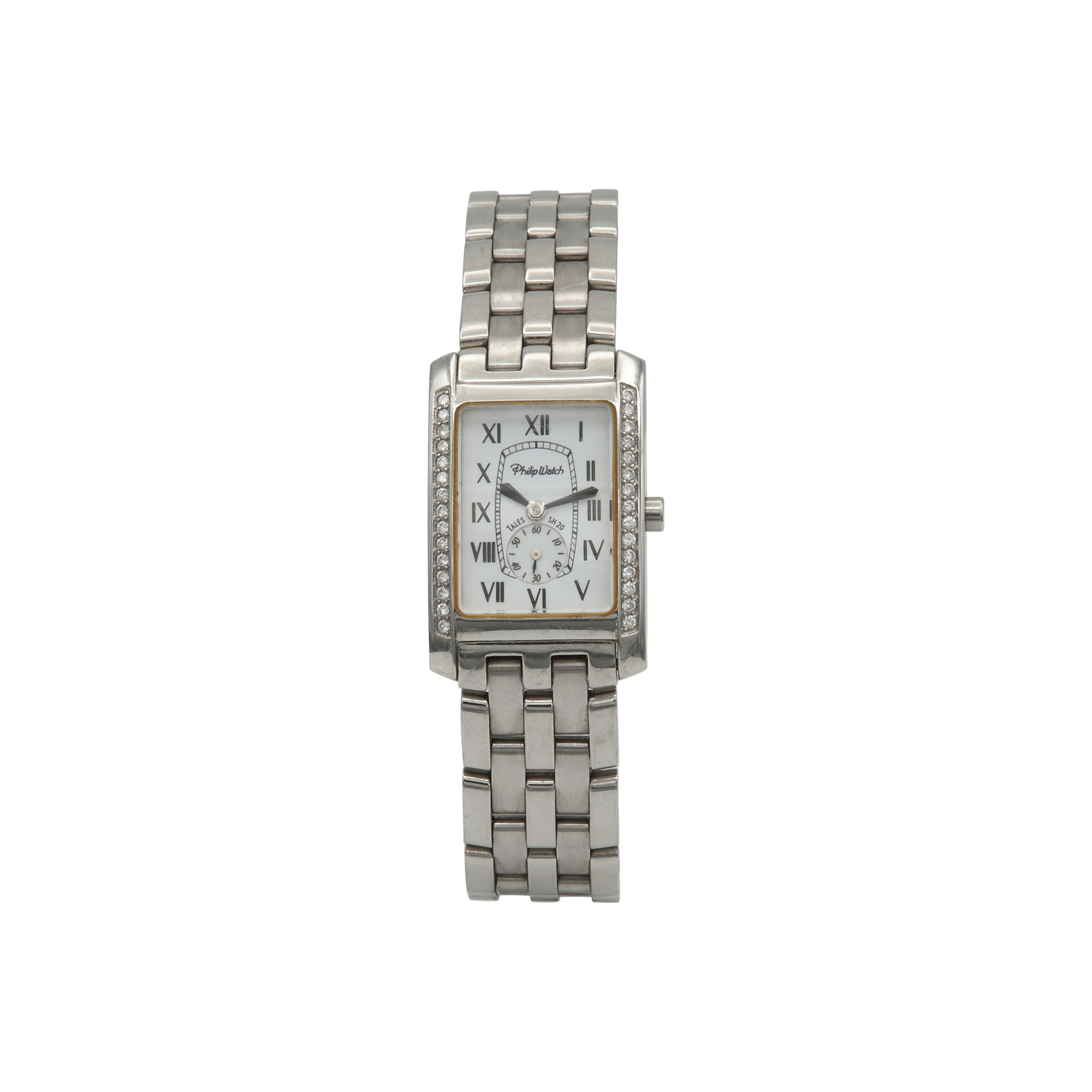 Orologio Philippe Watch Lady, cassa e cinturino in acciaio. Diamanti sulla cassa. Quadrante bianco. Vetro minerale. Numeri romani. Movimento al quarzo. Serie 8251422555
