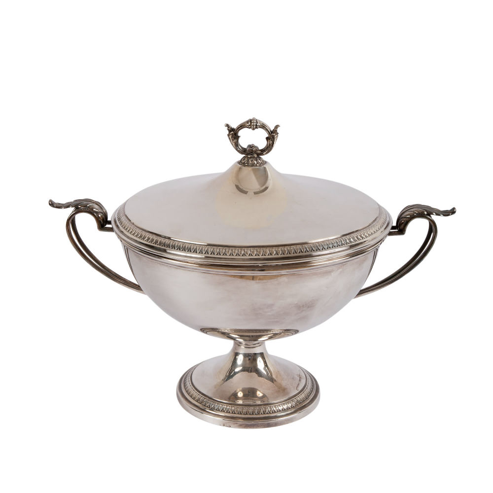 Zuppiera in argento 800/1000 con coperchio e manici. Stile impero. Peso complessivo 1870 gr