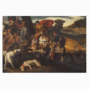 Scuola italiana, sec. XVII SCENA DI CACCIA olio su tela, cm 107x49 Italian school, 17th century HUNT SCENE oil [..]