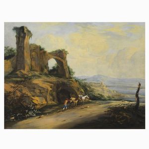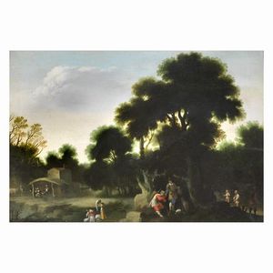 Scuola napoletana, sec. XVII PAESAGGIO CON FIGURE E BORGHI NELLO SFONDO olio su tela, cm 58x69 Neapolitan school, [..]