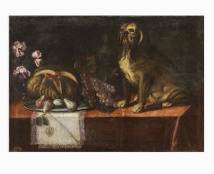 Scuola emiliana, sec. XVII NATURA MORTA CON FRUTTA E CANE olio su tela, cm 74x107,5 Emilian school, 17th century [..]