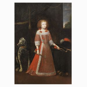 Philibert Torret (Francia, 1595 ca. - Torino 1669) RITRATTO DI CARLO EMANUELE II DI SAVOIA CON CANE olio su tela, [..]