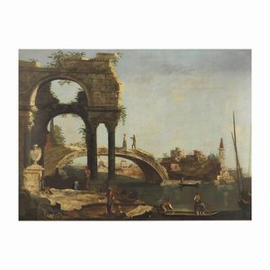 Scuola veneta, fine sec. XVIII VEDUTA DI LAGUNA CON ROVINE E FIGURE olio su tela. cm 112x148,5 Venetian school, [..]