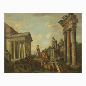 Scuola emiliana, sec XVIII CAPRICCIO ARCHITETTONICO CON ROVINE CLASSICHE E PERSONAGGI olio su tela, cm 71x90,5 [..]