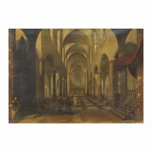 Scuola francese, inizi sec. XIX INTERNO DI CHIESA CON FIGURE olio su tela, cm 90,5x124,5 French school, early [..]