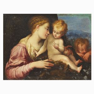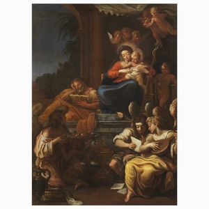 Scuola parmense, meta sec. XVII SACRA FAMIGLIA CON SAN GIOVANNI BATTISTA E ANGELI olio su tela, cm 99x69 Parmesan [..]