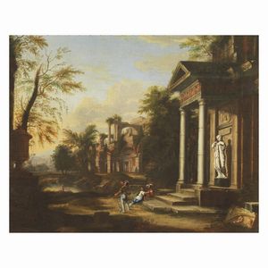 Scuola romana, sec. XVII CAPRICCIO ARCHITETTONICO CON FIGURE olio su tela, cm 74,5x91 Roman school, 17th century [..]