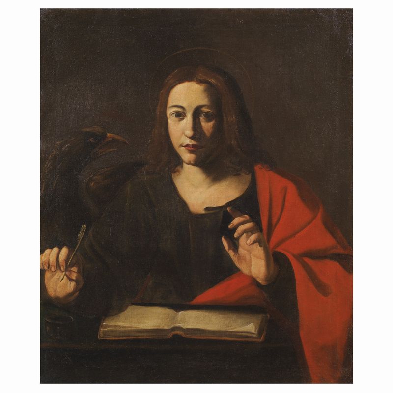Artista caravaggesco, prima metà sec. XVII SAN GIOVANNI EVANGELISTA olio su tela, cm 87x73 Caravaggesque artist, first half 17th century SAINT JOHN THE EVANGELIST oil on canvas, cm 87x73