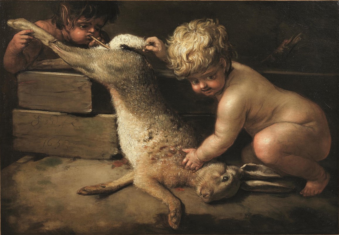 La realizzazione mimetica sin nei dettagli e molto materica della lepre che occupa il centro di questa composizione, prossima ai modi di Jan Fyt, e l’atmosfera in stretta contiguità con il mondo dei cosiddetti tenebrosi veneti, permettono di sciogliere la sigla in Jacob van der Kerckhoven, detto Giacomo da Castello (Anversa 1637-Venezia 1712), naturamortista documentato nel 1649 nella bottega del già citato Jan Fyt e successivamente attivo a Venezia dove collabora con pittori di figura quali Karl Loth, per esempio in un’Allegoria dell’autunno in collezione Manfrin (cfr. G. Nicoletti, Pinacoteca Manfrin a Venezia, Venezia 1872, p. 19; si veda anche E. A. Safarik – F. Bottari, Jacob van de Kerckoven in La natura morta in Italia, a cura di F. Porzio, direzione scientifica di F. Zeri, II, Milano 1987, pp. 355-363). Anche il dipinto offerto presenta una lettura allegorica simile in quanto i due putti sono intenti in un’attività, lo scuoiare una lepre, tipica dei mesi invernali: è assai probabile che la tela facesse parte di una serie di quattro sovrapporta alludenti alle quattro stagioni, serie che richiese la collaborazione tra un artista specializzato nella raffigurazione di animali e di elementi del mondo vegetale e un altro per le figure.
