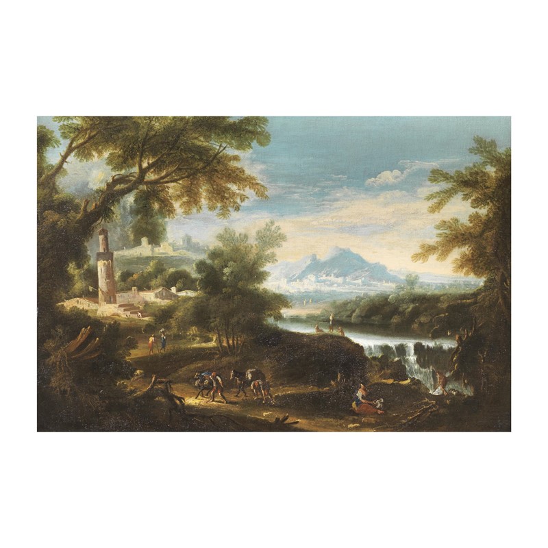 Bartolomeo Pedon (1665-1732) PAESAGGIO FLUVIALE CON ANTICO BORGO E TORRE PAESAGGIO FLUVIALE CON FIGURE, PONTE E ARMENTI coppia di dipinti a olio su tela, cm. 45,7X68,5 (2)