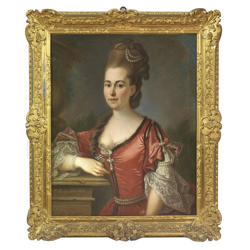 Pierre Jouffroy (attivo tra il 1742 e il 1776) RITRATTO DI GENTILDONNA olio su tela, cm 82,5x66 firmato e datato "P. Jouffroy fecit 1773" in basso a sinistra sulla base.