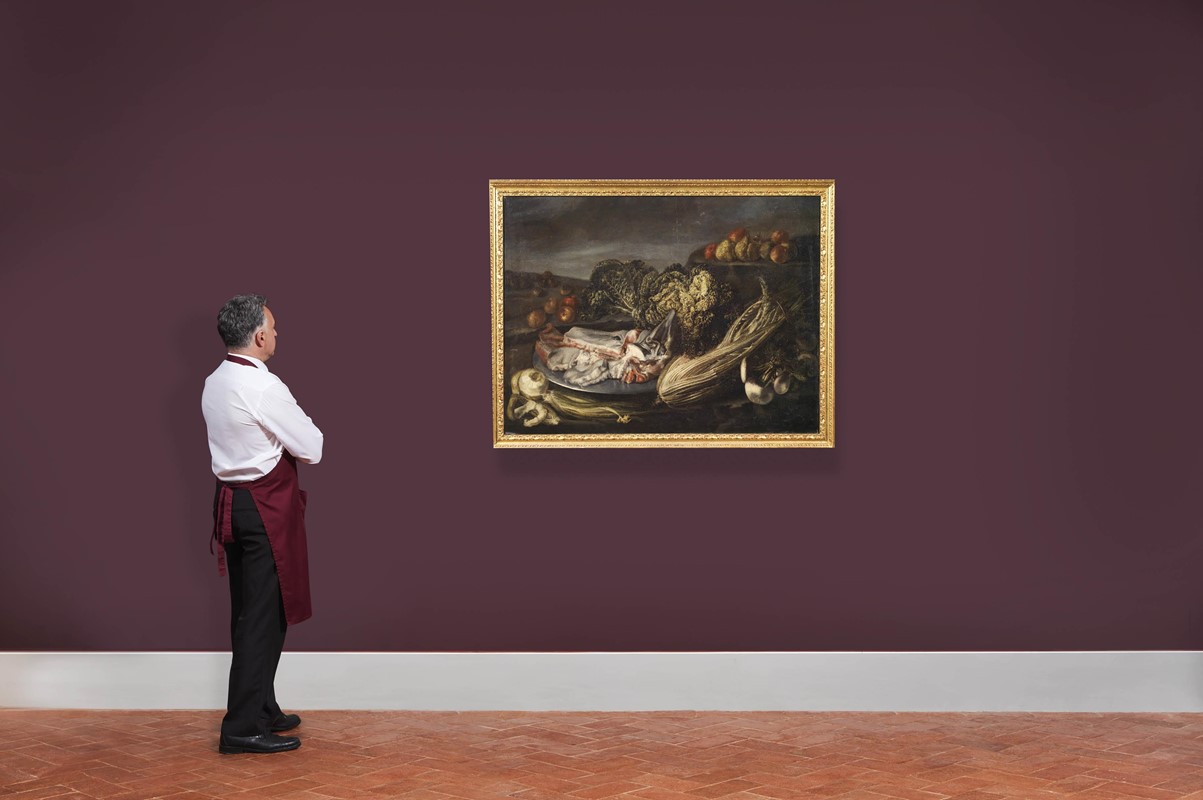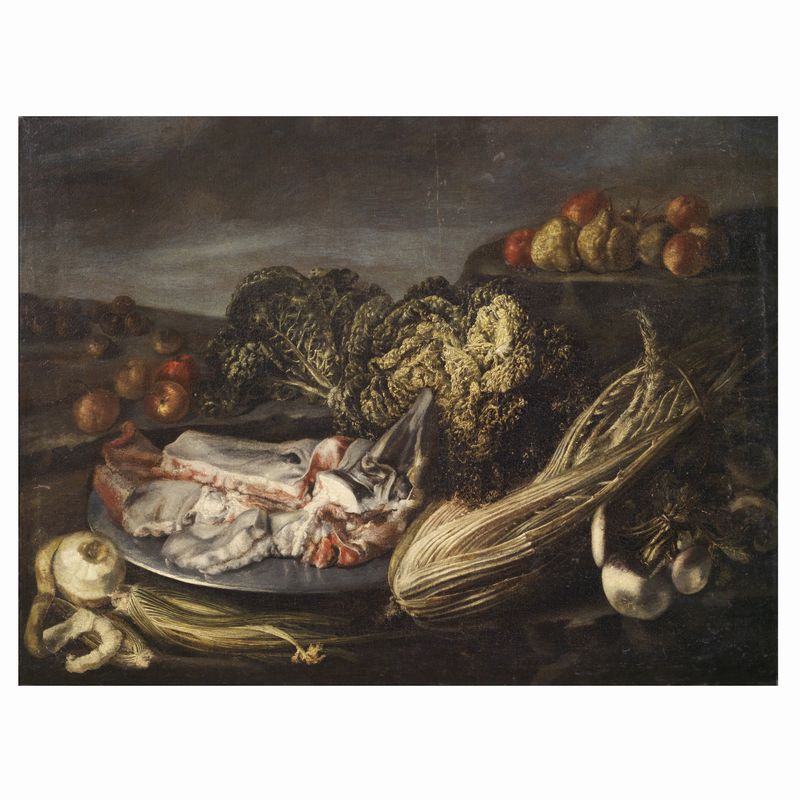 NATURA MORTA CON FRUTTA, VERDURA E TESTA DI VITELLO