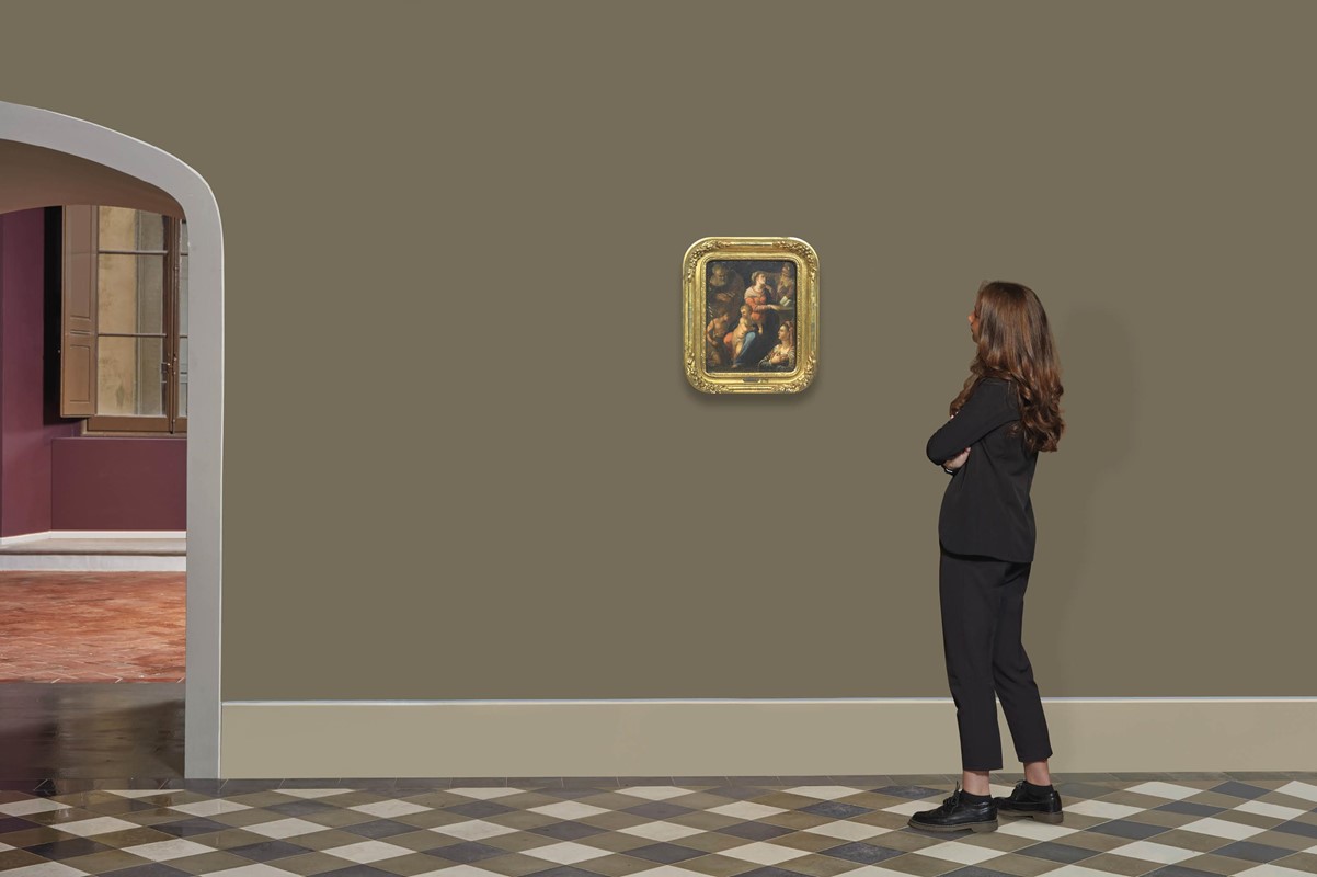 Emilian school, second half of sec. XVI HOLY FAMILY WITH SAINT JOHN THE BAPTISTE, SAINT CATHERINE OF ALEXANDRIA AND ANOTHER SAINT oil on panel, cm 32x26
