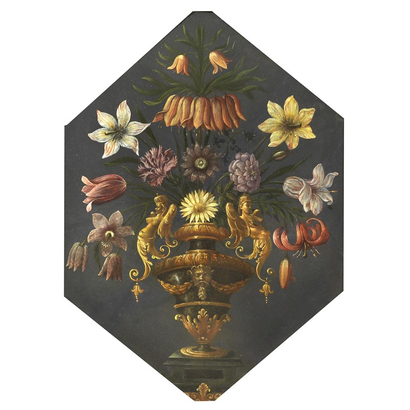 L'opera, di elevato livello qualitativo, mostra una minuziosa resa dei dettagli del vaso a grottesche e una meticolosa analisi dei fiori nei loro minimi dettagli.