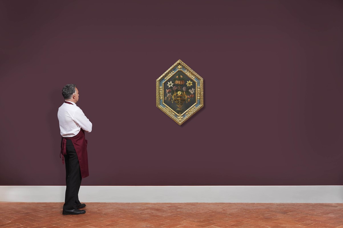 L'interessante natura morta qui proposta, di particolare pregio ed eleganza presenta dimensioni più elevate rispetto quelle generalmente utilizzate per questa tipologia di supporto ed è da considerarsi non solo come un dipinto ma come un vero e proprio oggetto d'arte.