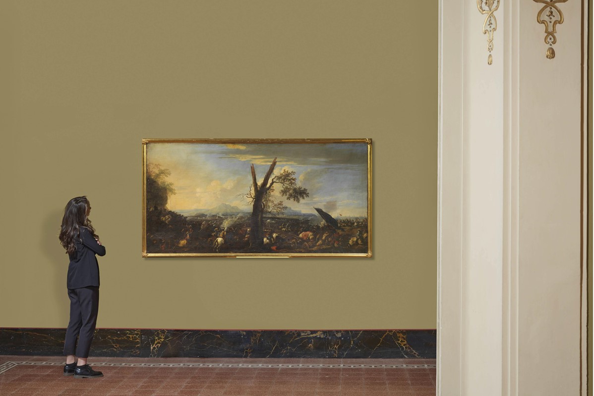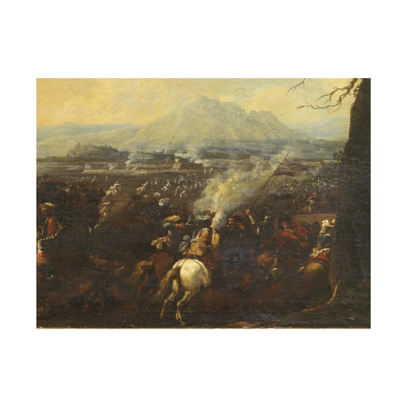 Questo spettacolare dipinto di battaglia con le sue generose dimensioni che ne amplificano l’impianto scenico e monumentale è a nostro parere ascrivibile ad una felice mano della scuola romana del XVII secolo ,che vide come protagonisti veri e propri Maestri di questo genere pittorico, come Michelangelo Cerquozzi ( 1602- 1660) e Jacques Courtois detto il Bergognone( Saint-Hyppolite 1621- Roma 1676),i quali ne influenzeranno in maniera determinante la sua evoluzione in chiave contemporanea , decretando il successo di questi soggetti pittorici.