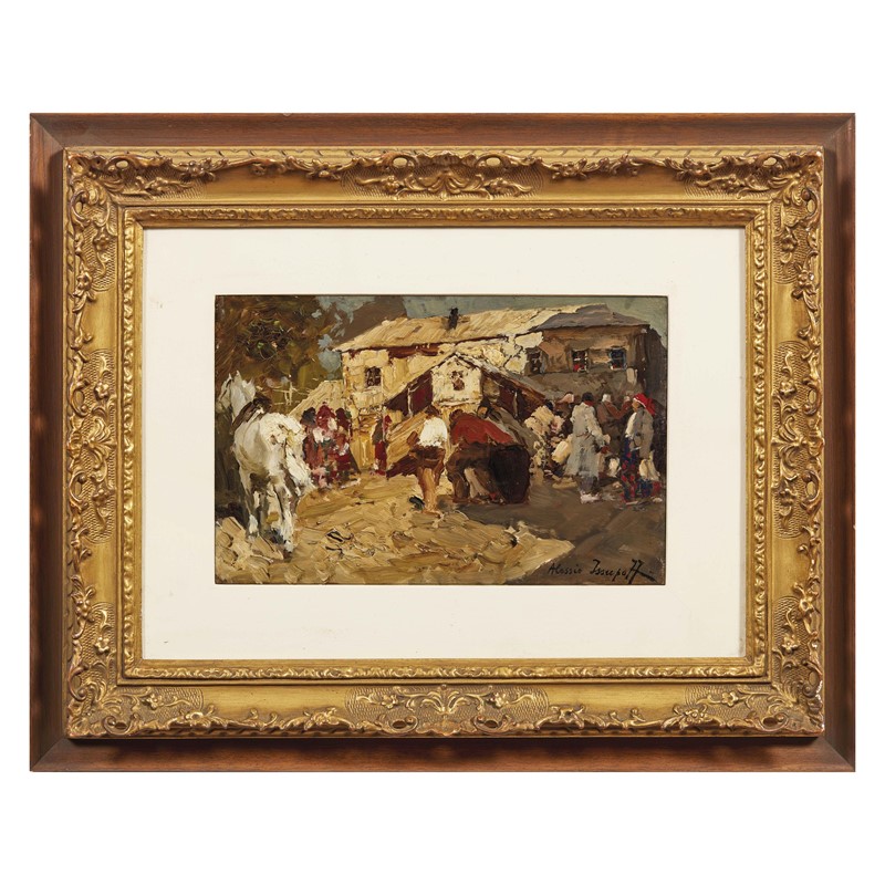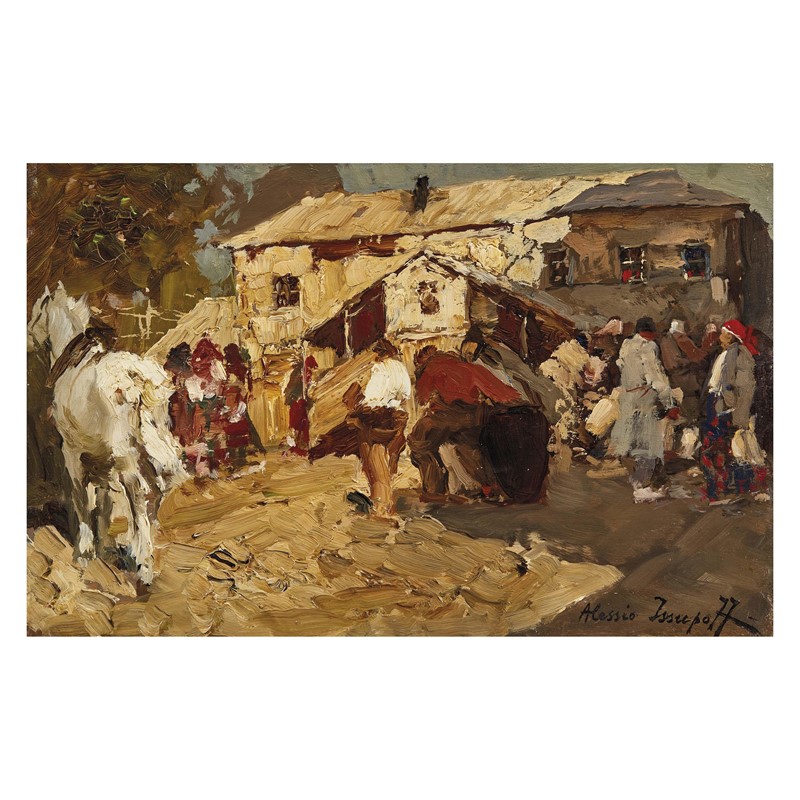 Alessio Issupoff (Viatka (Russia) 1889 - Roma 1957) NEL CORTILE DELLA FATTORIA olio su compensato, cm 17,5x28 firmato in basso a destra retro: timbro della Mondial Gallery di Milano, iscritto a lapis “Nel cortile della fattoria”