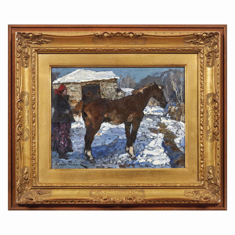 Alessio Issupoff (Viatka (Russia) 1889 - Roma 1957) PAESAGGIO INNEVATO CON CONTADINA E CAVALLO olio su tavoletta, cm 23x30 firmato in basso a sinistra retro: dedicato alla signora A. Sperati, firmato e datato “22 dic. 1950 / Roma”