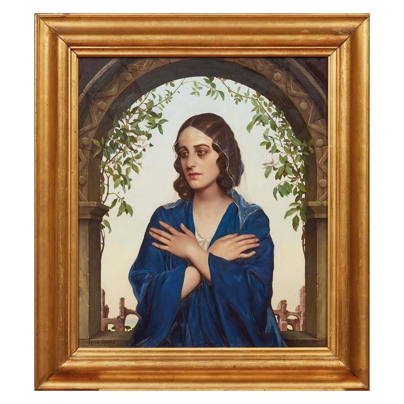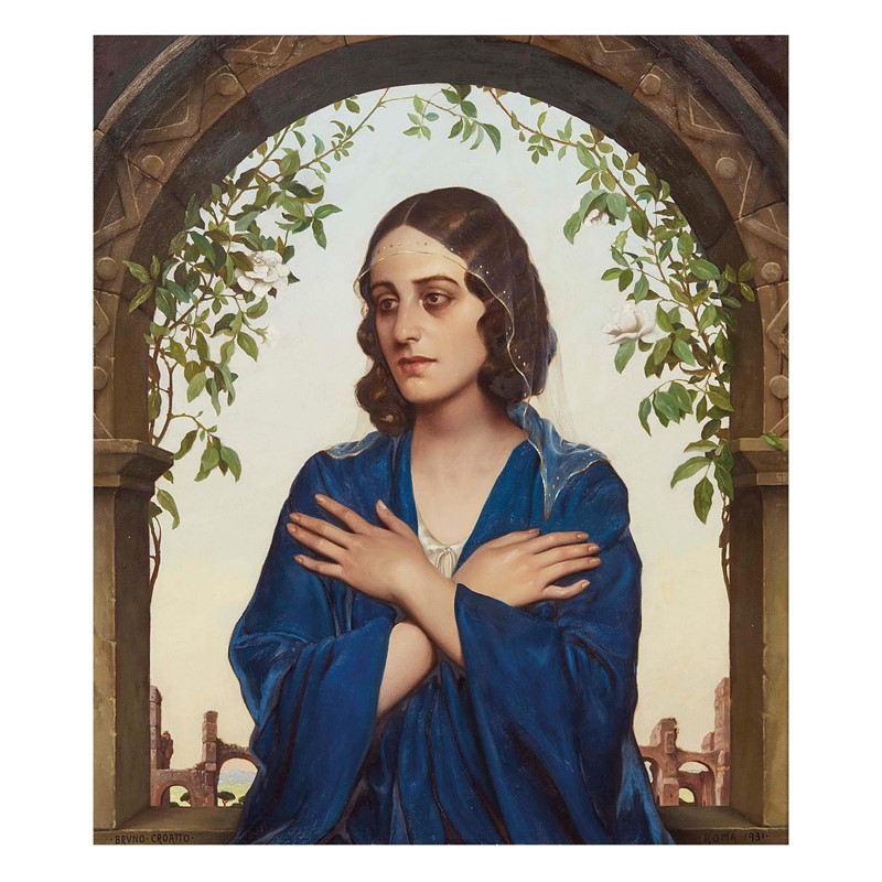 Bruno Croatto (Trieste 1875 - 1948) LA VERGINE DELLA CAMPAGNA ROMANA olio su tavola, cm 61x52,5 firmato in basso a sinistra e datato Roma 1931 in basso a destra