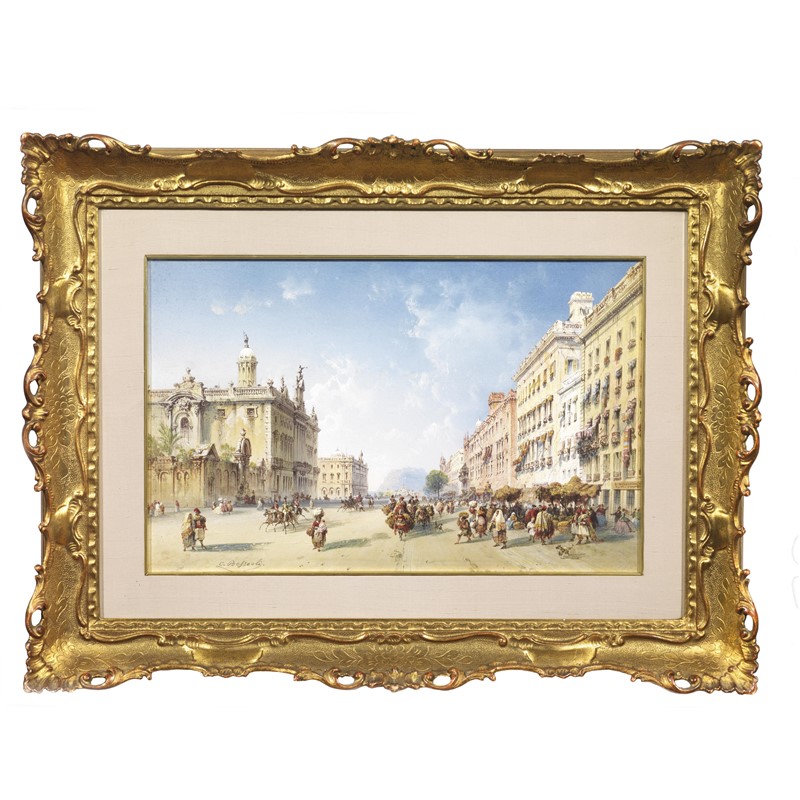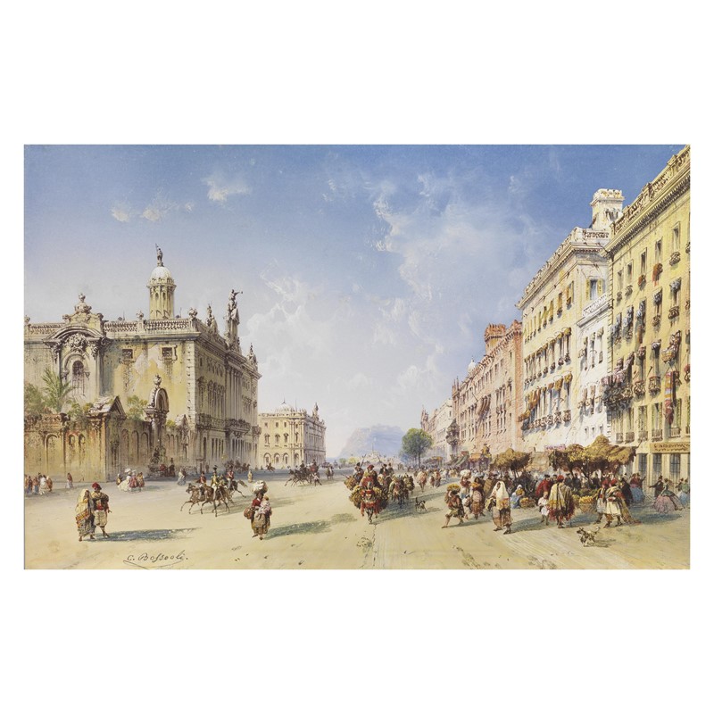 Carlo Bossoli (Davesco 1815 - Toino 1884) BARCELLONA gouache su carta, cm 27,4x42,5 firmato in basso a sinistra retro: cartiglio della Galleria d'Arte Fogliato di Torino; sul retro del foglio: timbro della Gall'eria d'Arte Fogliato per autentica n.830