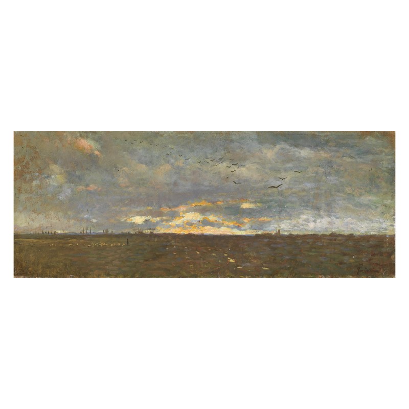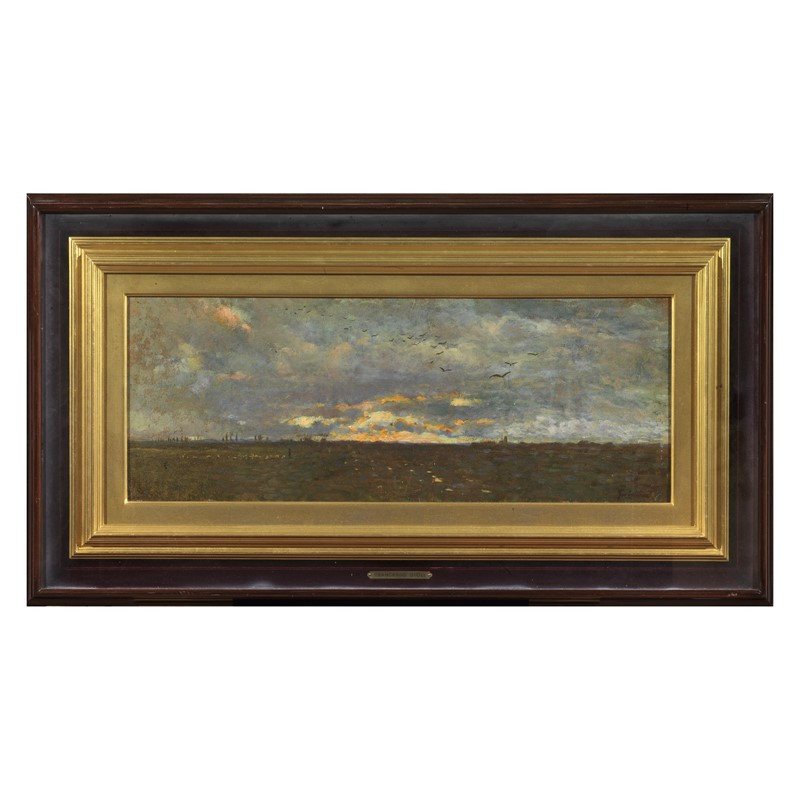 Francesco Gioli (San Frediano a Settimo 1846 - Firenze 1922) TRAMONTO IN MAREMMA olio su cartone, cm 26x69 firmato in basso a destra retro: cartiglio della Galleria d'Arte Manzoni di Milano, cartiglio della Galleria d'Arte Bentivegna di Montecatini