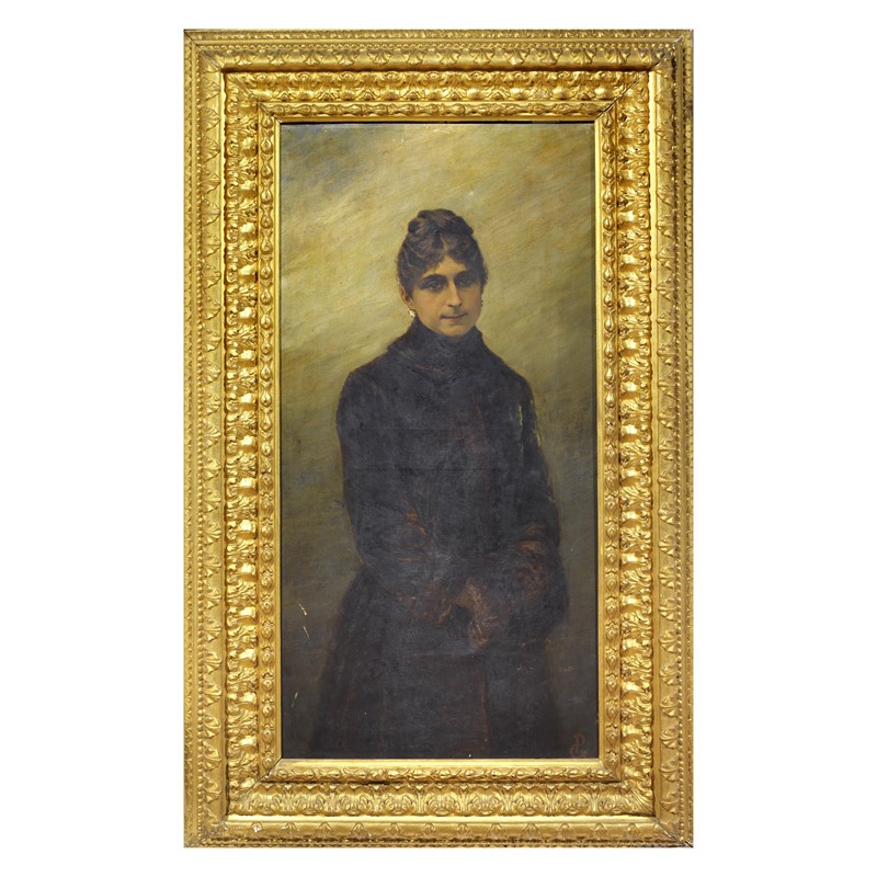 PORTRAIT OF PRINCESS ANNA MARIA TORLONIA oil on canvas, 120x59 cm initialled lower right on the reverse: label inscribed Ritratto di/ S.E. la P.ssa Anna/ Maria Torlonia/ eseguito dal/ Professore Giovanni/ Piancastelli/ nel/ 1899 Roma