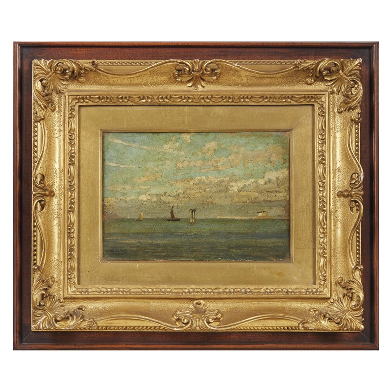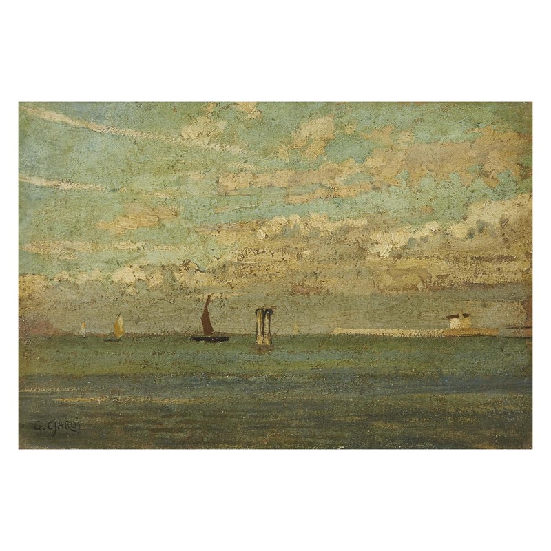 Guglielmo Ciardi (Venezia 1842 - 1917) VEDUTA DELLA LAGUNA VENEZIANA olio su cartoncino applicato su cartoncino, cm 15x22 firmato in basso a sinistra retro: timbro della Mondial Gallery di Milano
