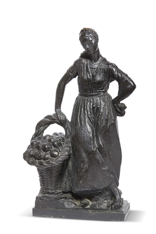 La bella scultura di Libero Andreotti che abbiamo il piacere di presentare raffigura una giovane donna in piedi con le gambe incrociate colta in un momento di riposo dopo aver posato a terra un grande cesto di frutta. Le pieghe della veste accompagnano le forme del corpo, mentre la mano sinistra, che poggia con grazia sul fianco, tiene nel palmo un frutto. Forte è il legame con i modelli dello scultore francese Émile-Antoine Bourdelle – a cui Andreotti guardò con molta attenzione – in particolare con il bronzetto raffigurante La moglie dello scultore, con cui la nostra condivide la costruzione solida della figura e la posizione del braccio destro, leggermente arcuato, tramite il quale la donna scarica il proprio peso sull’oggetto al suo fianco.