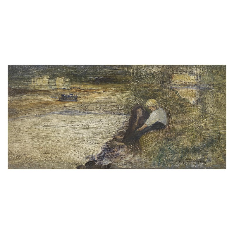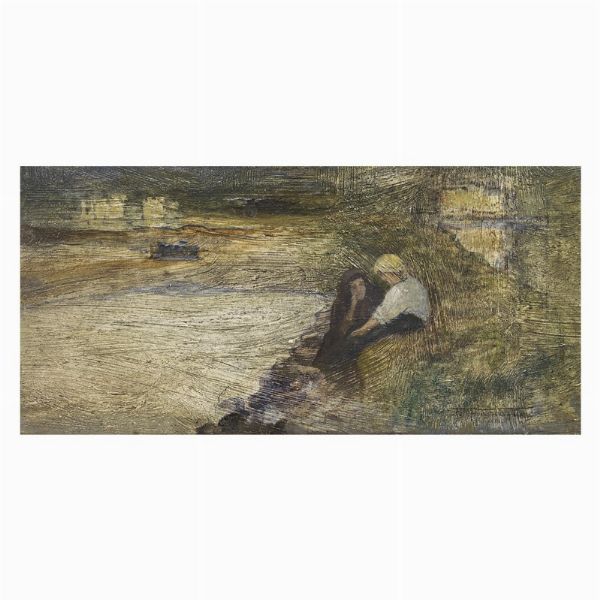 STUDY FOR CONFIDENCES oil on cardoard, 11x22 cm signed lower right on the reverse: inscribed studio per opera 'Confidenze'/ di mio fratello Pietro firmato Antonietta Fragiacomo, label inscribed 134