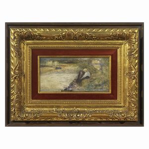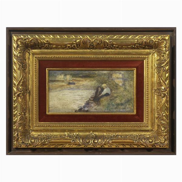 Pietro Fragiacomo (Trieste 1856 - Venezia 1922) STUDIO PER CONFIDENZE olio su cartone, cm 11x22 firmato in basso a destra retro: iscritto studio per opera 'Confidenze'/ di mio fratello Pietro firmato Antonietta Fragiacomo, cartiglio iscritto 134