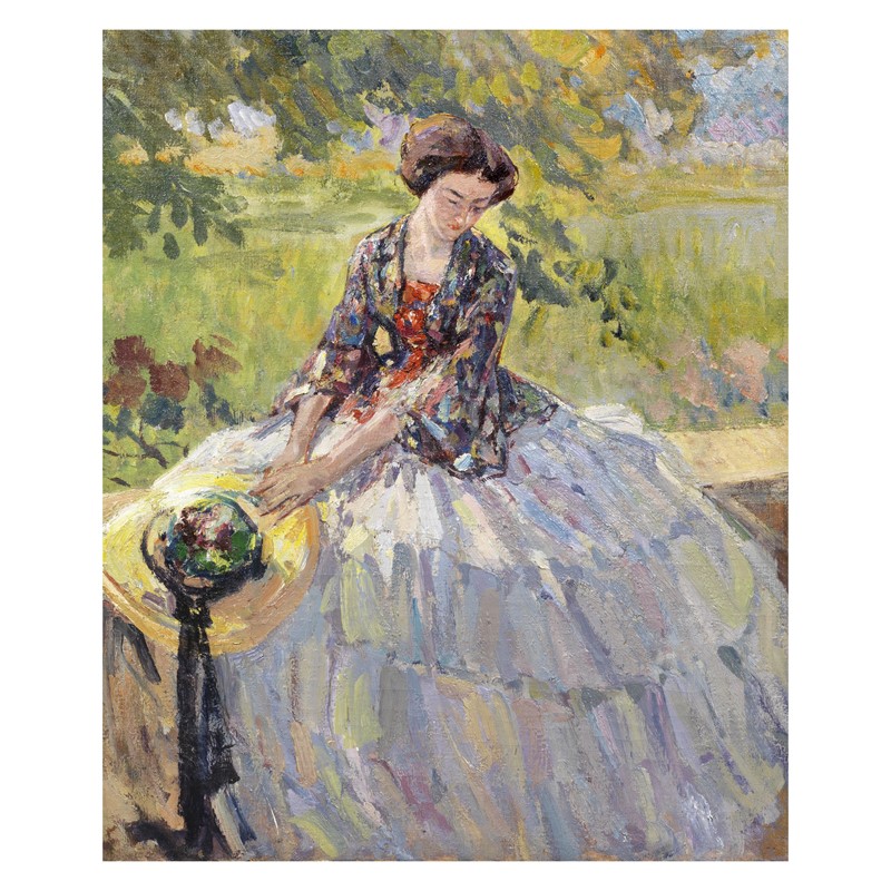 WOMAN IN A GREEN GARDEN oil on canvas, 73x60 cm on the reverse: inscribed opera autentica di mio/ padre Ulisse Caputo eseguita/ a Aix en provence nel 1920/ Aldo Caputo