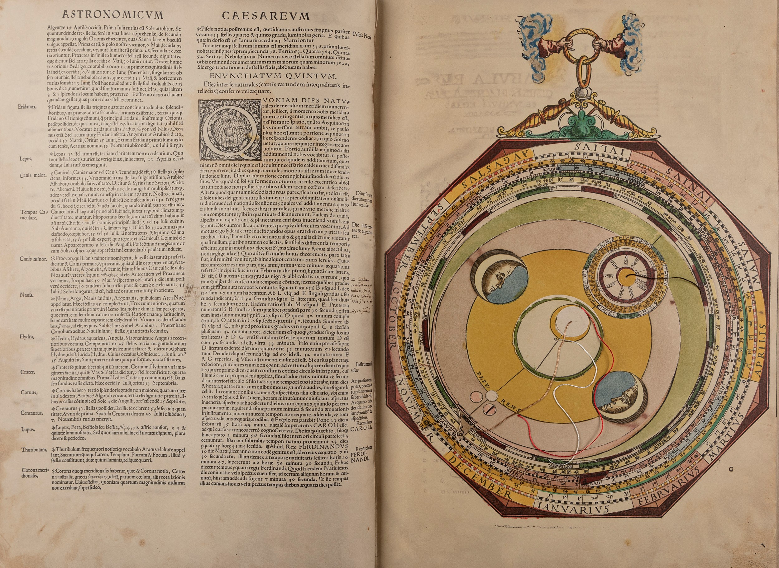 1967 Leipzig, 1967. 444 x 310 mm. Titolo entro bordo xilografico colorato e con grande vignetta colorata, 38 xilografie in facsimile a piena pagina a colori (22 con volvelle), numerosi schemi a colori e xilografie, legatura in vitello, titolo dorato, cofanetto originale. Commentario a cura di Diedrich Wattenberg, Peter Apianus and his Astronomicum Caesareum, 1967. Esemplare n.234/750.