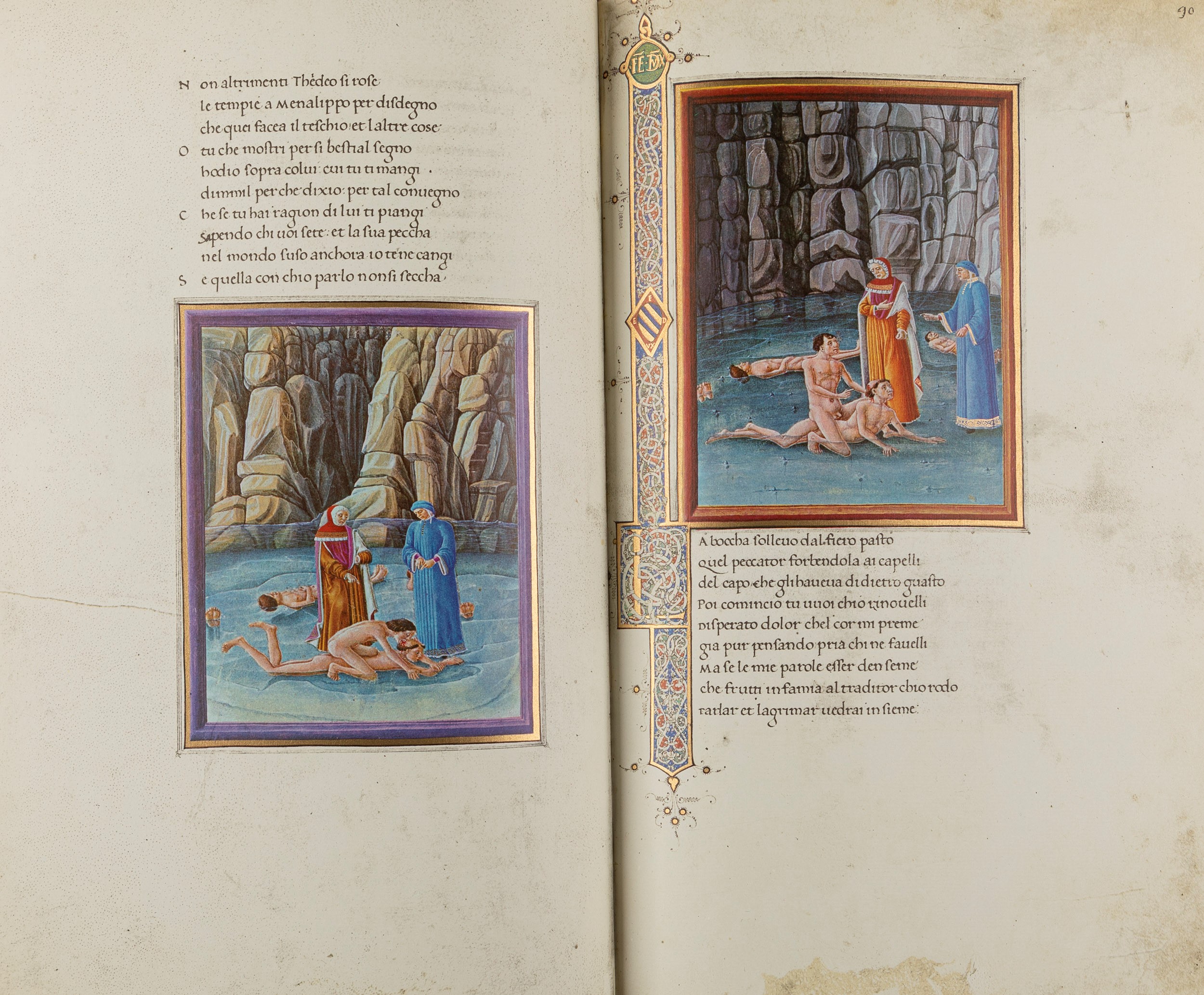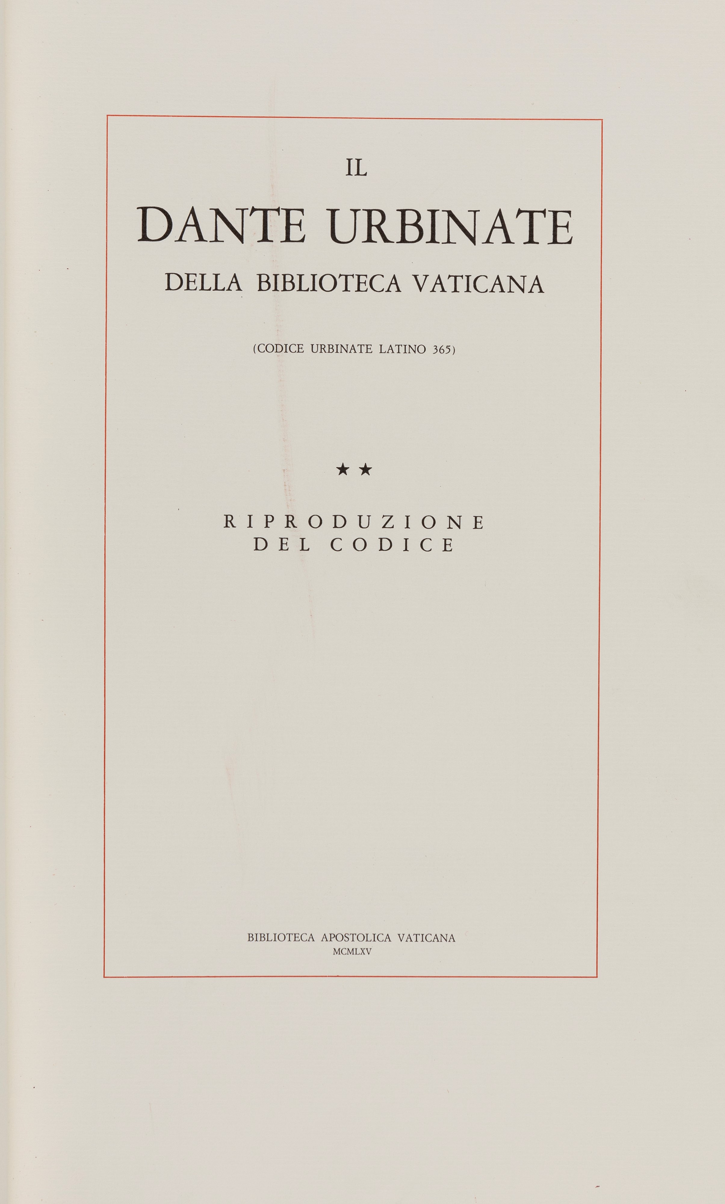 1965 Milano, Fratelli Fabbri, 1965. 385 x 240 mm. Legatura in pelle rossa con cornici in oro ai piatti, spellature, il commentario in mezza pelle e tela a cura di Michelini Tocci, Salmi e Giorgio Petrocchi. Cofanetto editoriale, esemplare n.55/750.