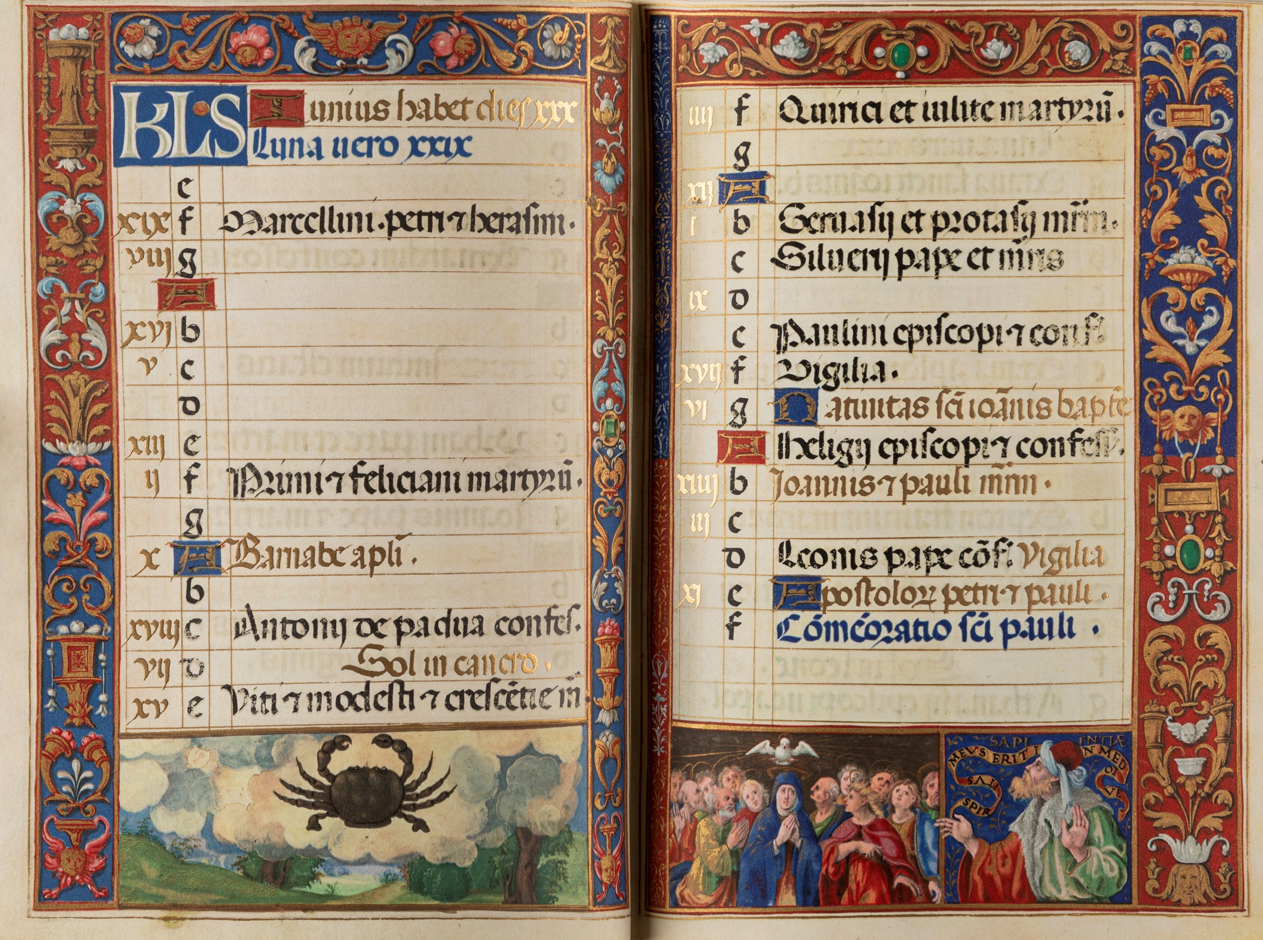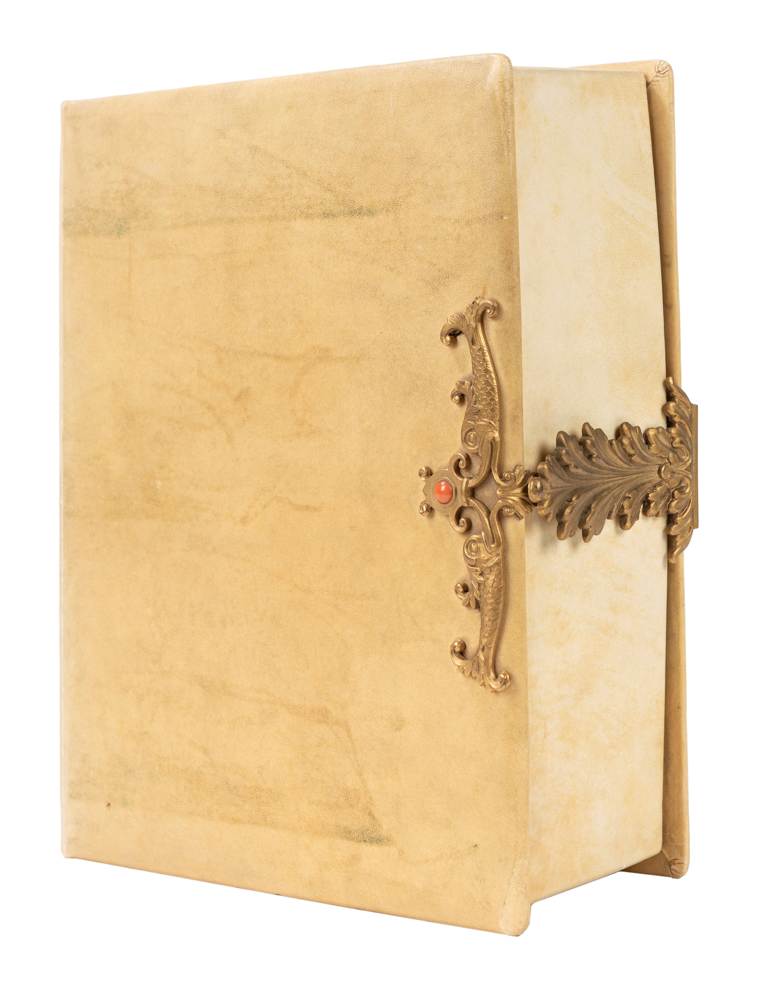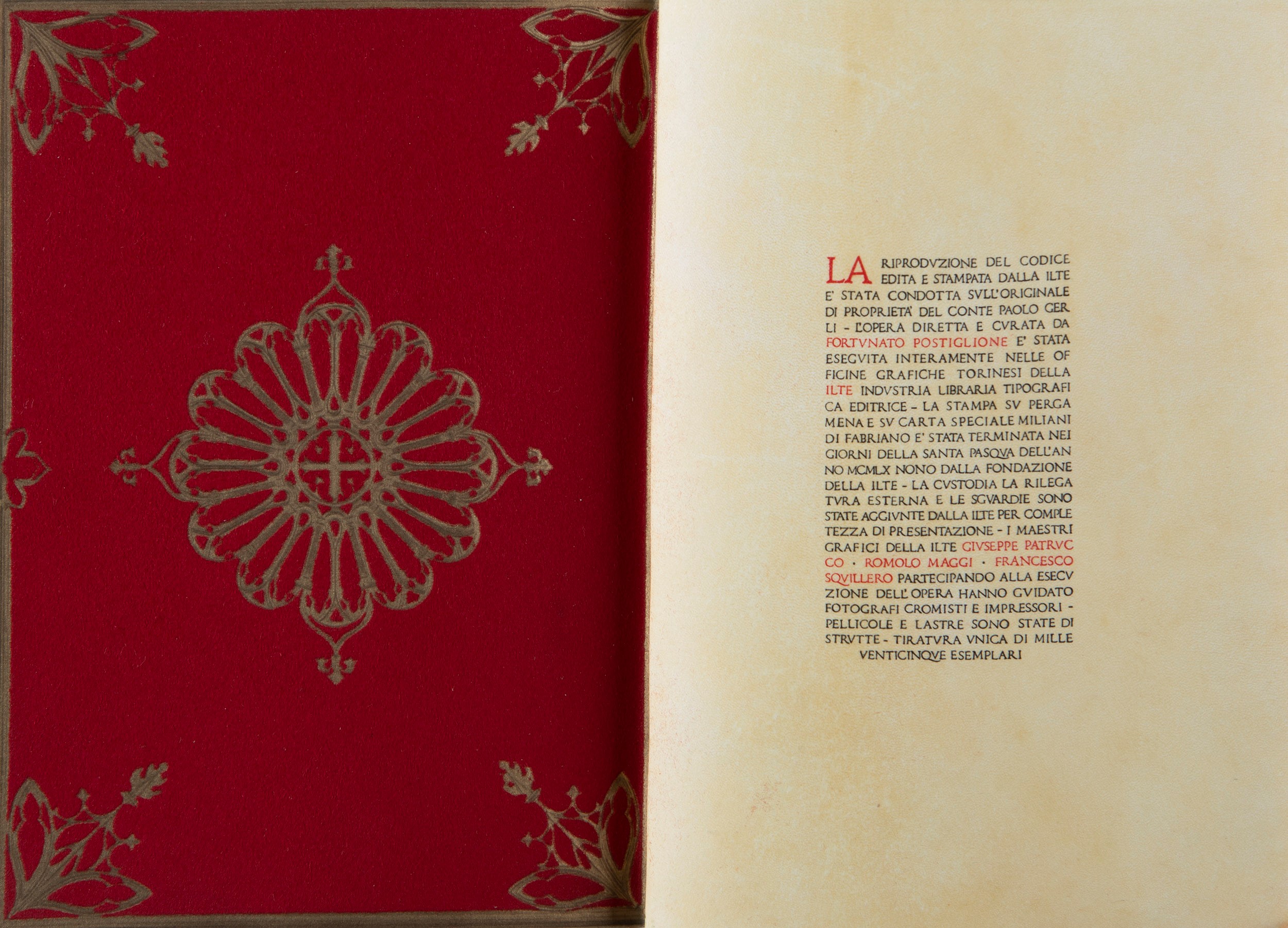 Torino, Ilte, 1960. 238 x 180 mm.Pergamena e carta speciale Milani Fabriano, tirata di 1025 esemplari, legatura in pergamena editoriale con ai piatti cornici in metallo dorato in rilievo racchiudenti la riproduzione di 2 delle miniature interne a 18 colori, fregio a colori anche al dorso, tagli dorati, doppie sguardie, riproduzione in vellutino rosso e oro della legatura rinascimentale originale, cofanetto editoriale in pergamena con foglie d'acanto e delfini che formano un fermaglio in metallo dorato in stile rinascimentale. Tiratura di 1025 esemplari.