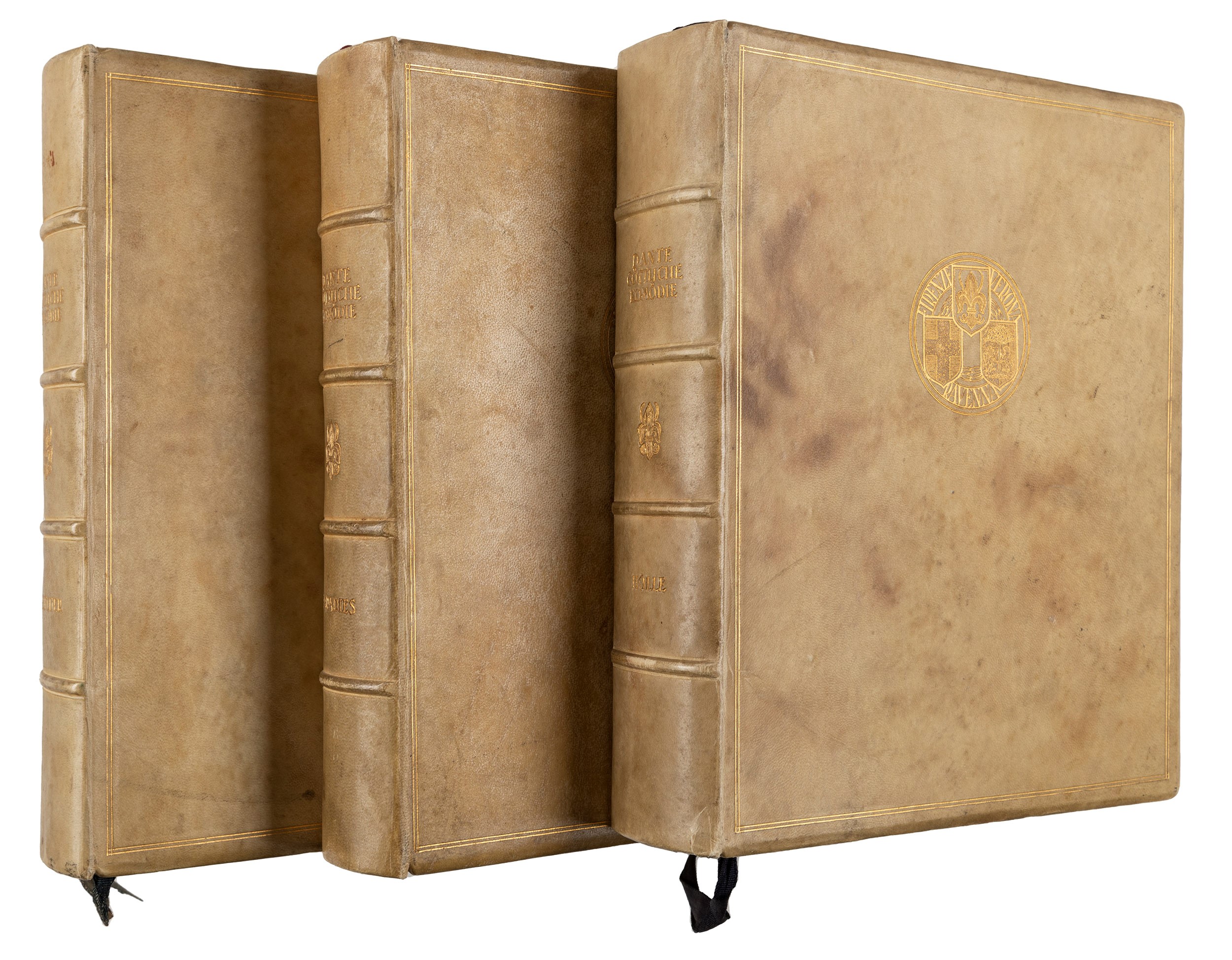 1921 Zurigo-Lipsia-Vienna: Amalthea, 1921. 3 volumi. 265 x 220 mm. Testo contenuto in cornice, con 60 fototipie a colori applicate protette da velina, da originali di Franz VON BAYROS. Bella legatura originale in piena pergamena, al piatto anteriore medaglione impresso in oro che contiene gli stemmi delle città di Firenze, Verona e Ravenna, dorso a 4 nervi, tagli dorati. Esemplare n.27 con testo bilingue in italiano e tedesco e legatura eseguita a mano in piena pergamena. Copia destinata al Principe Philipp von Hessen, appartenuta ai due noti collezionisti: Ladislao Reti e Arthur Tekla Muller, con ex libris.