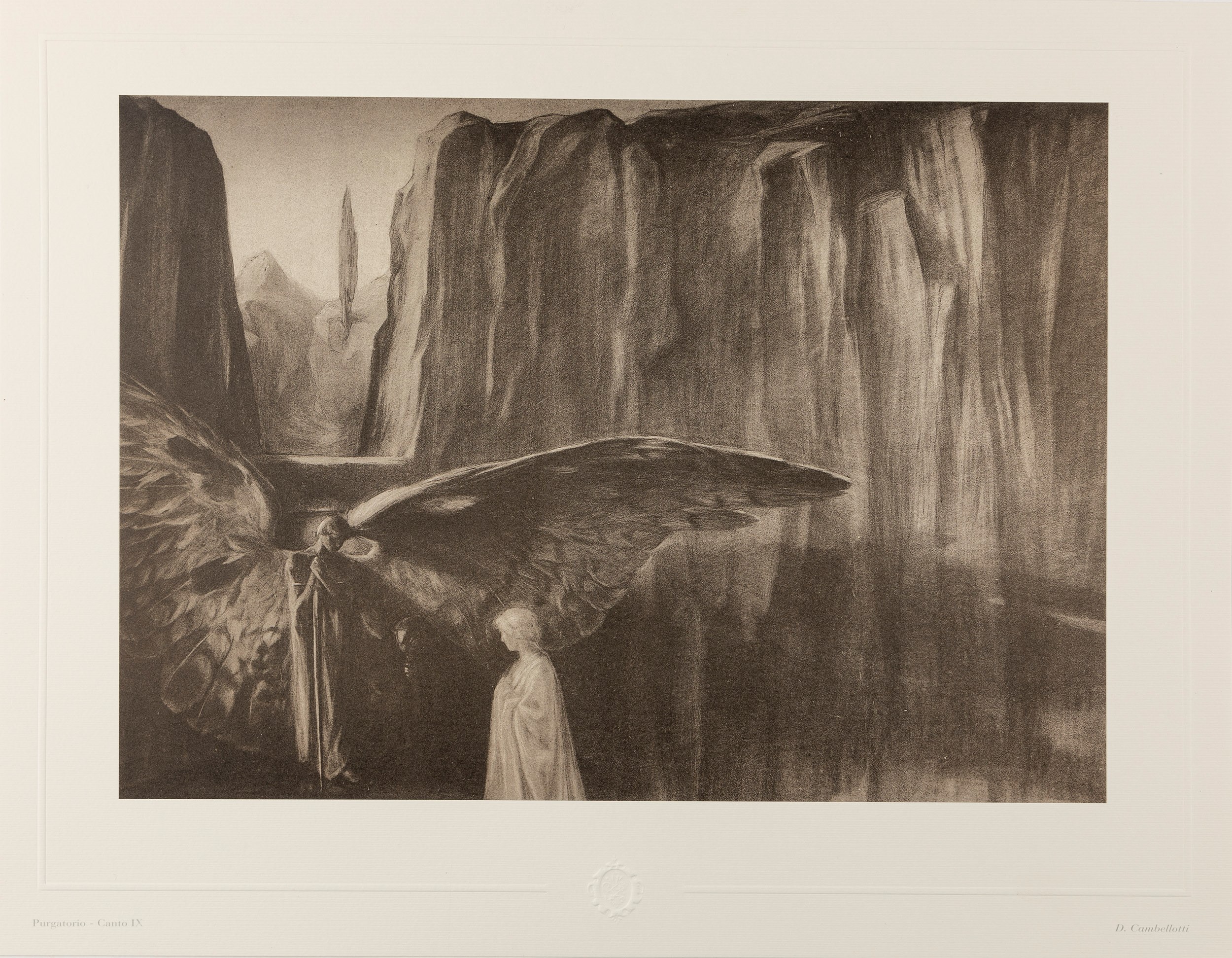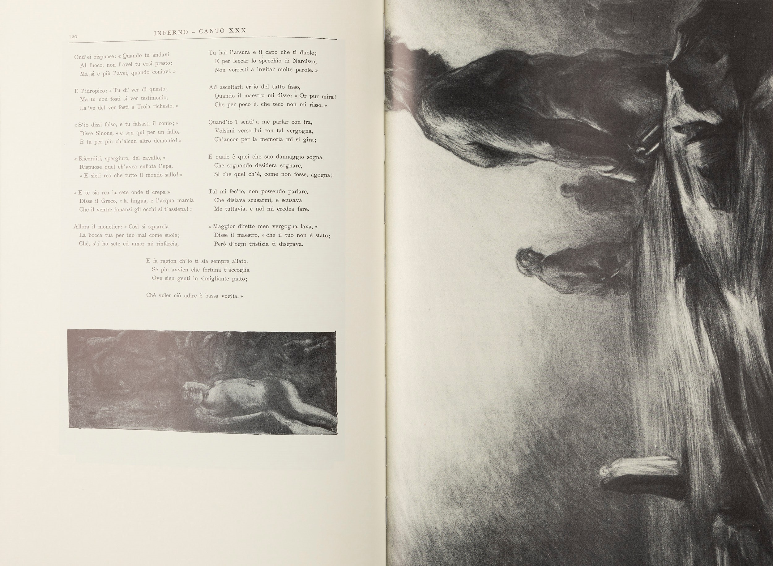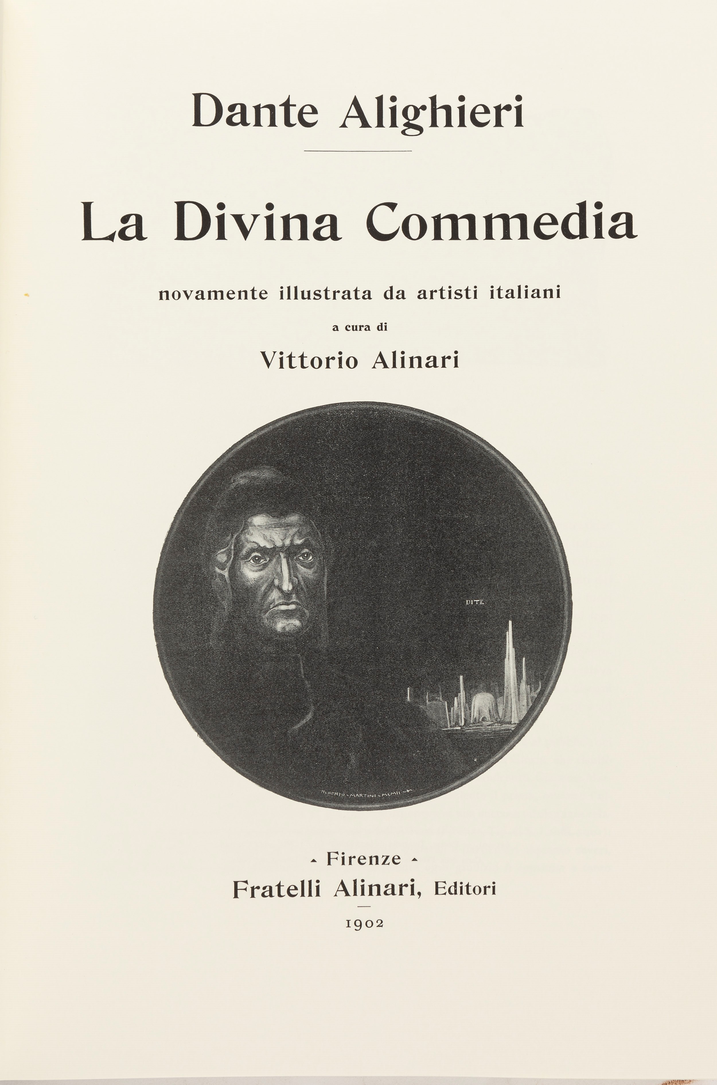 2002 Firenze, Fratelli Alinari, 1902 [2002]. Ristampa dell'edizione pubblicata nel 1902 da Alinari de La Divina Commedia nuovamente illustrata da artisti italiani, ri-pubblicata nel 2002 in occasione dei 150 anni di attività della Alinari, con allegate 36 tavole tirate dalle lastre originali di vetro con la tecnica della collotipia in tiratura limitata. In cofanetto editoriale dedicato, in piena tela rossa. Esemplare n.2/350.