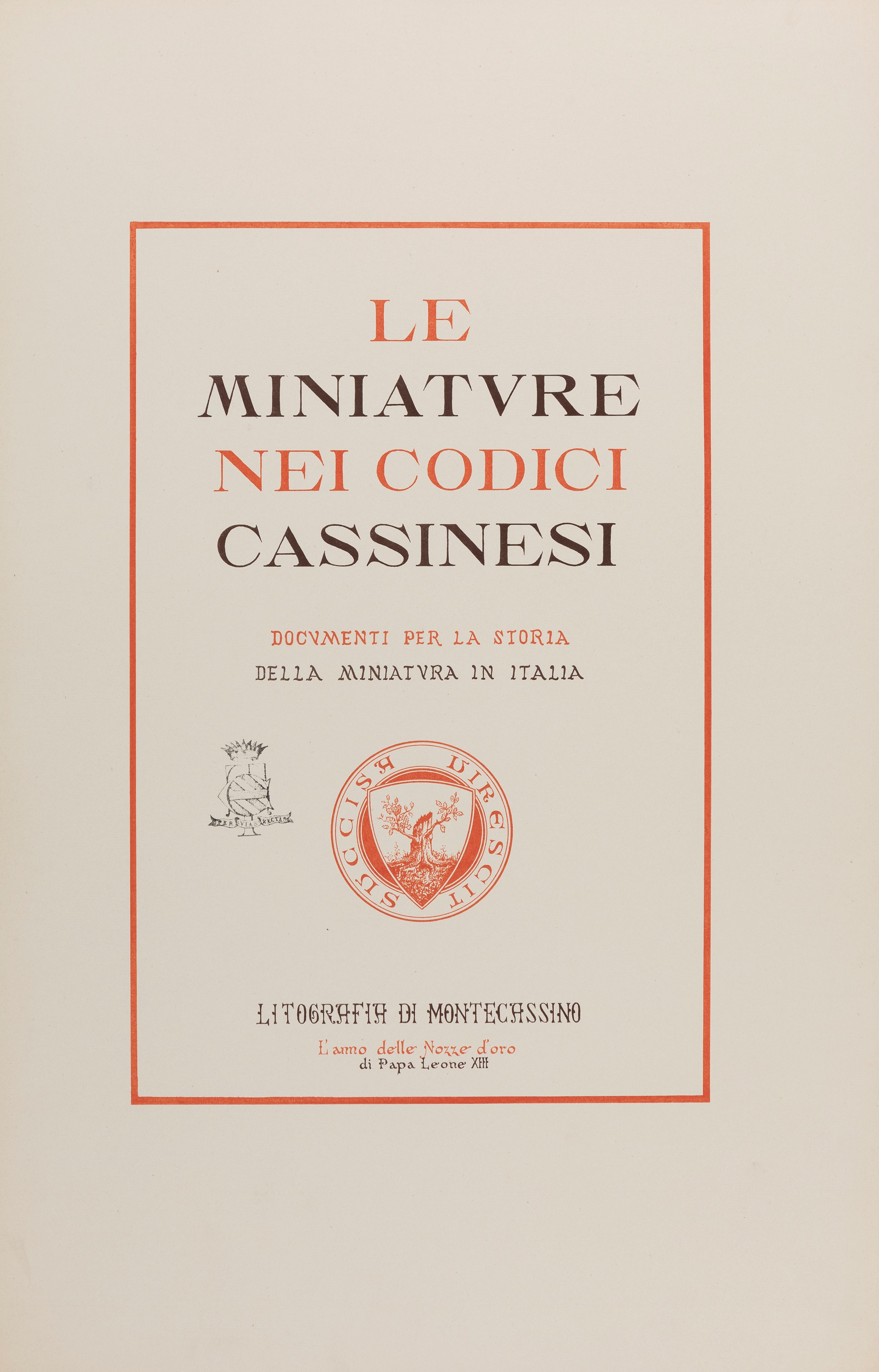 1899 Montecassino, 1899. 500 x 335 mm. Esemplare a fascicoli sciolti raccolti in una grande cartella in mezza tela verde. § Le miniature nei Codici Cassinesi. Montecassino, 1887. 500 x 335 mm. Esemplare a fascicoli sciolti raccolti in una grande cartella in mezza tela verde.