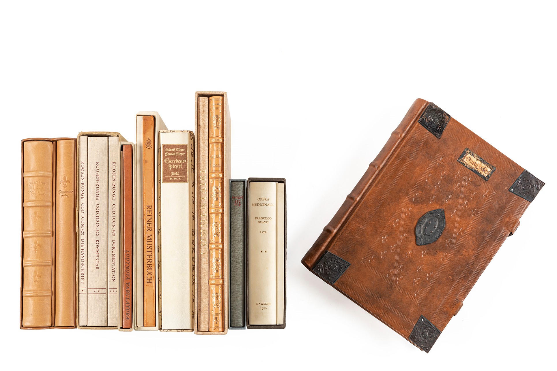 1981 Paris, Seefeld, 1981. 215 x 148 mm. Legatura in vitello con impressioni a secco, commentario rilegato in mezza pelle e cartone, titolo al dorso. Esemplare n.778/1000. Il tutto in cofanetto marrone con giglio fiorentino impresso ai piatti. - Enchiridion Virtutum Vegetabilium, Animalium, Mineralium ...Paris, Seefeld, 1984. Codex Vindobonensis 2396. Legatura in vitello con impressioni a secco ai piatti, dorate. Esemplare 391/1975. - Insieme nel lotto altri 3 facsimili di opere diverse, in diversi formati.