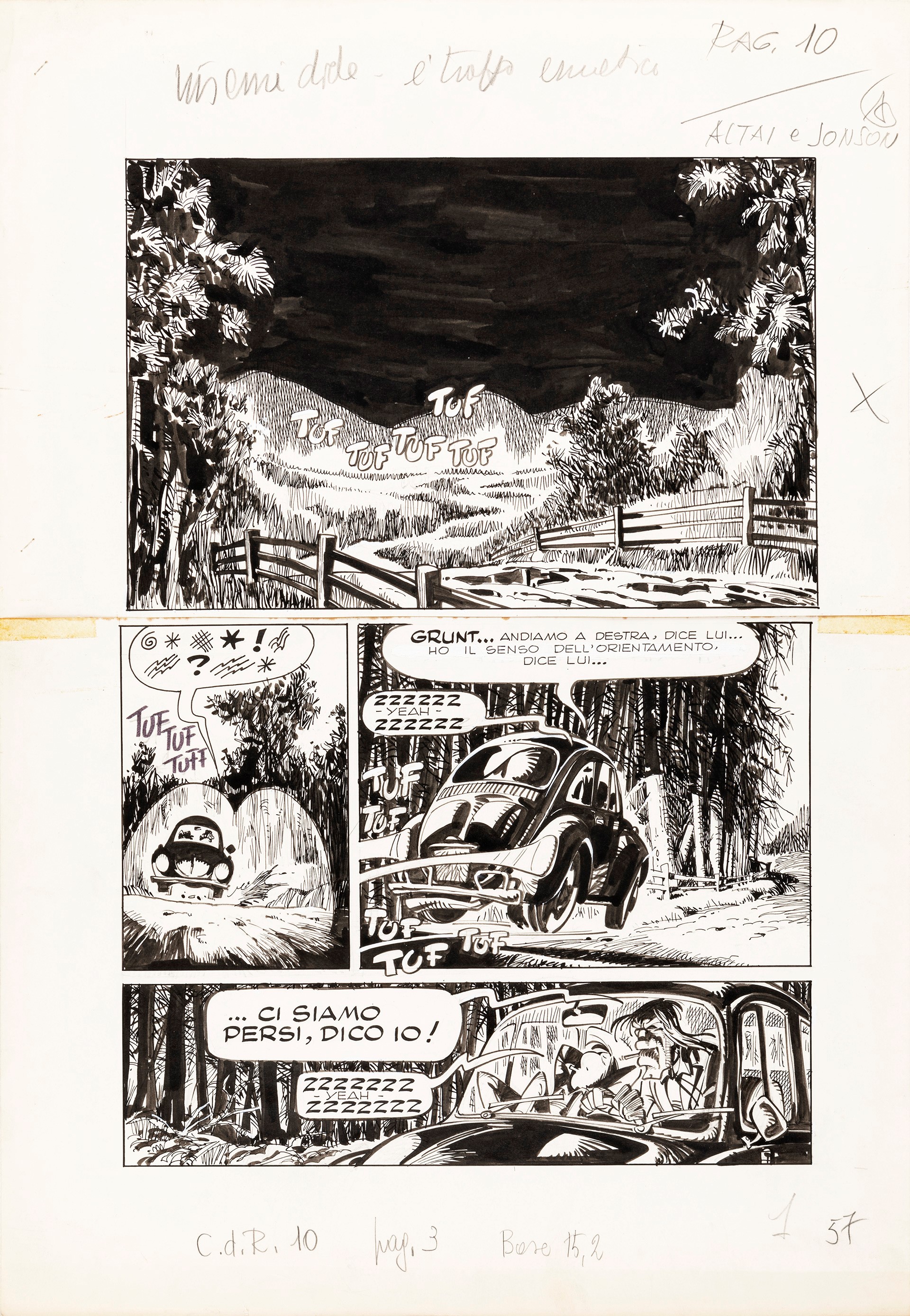 matita e china su cartoncino, 35,5 x 51 cm 1976 Title page originale realizzata da Cavazzano per Notte senza luna, l'undicesimo episodio della mitica serie Altai & Jonson pubblicato sul CdR n. 10 nel 1976. Nati nel 1975 dal fervido genio di Tiziano Sclavi e dal magistrale pennello di Giorgio Cavazza