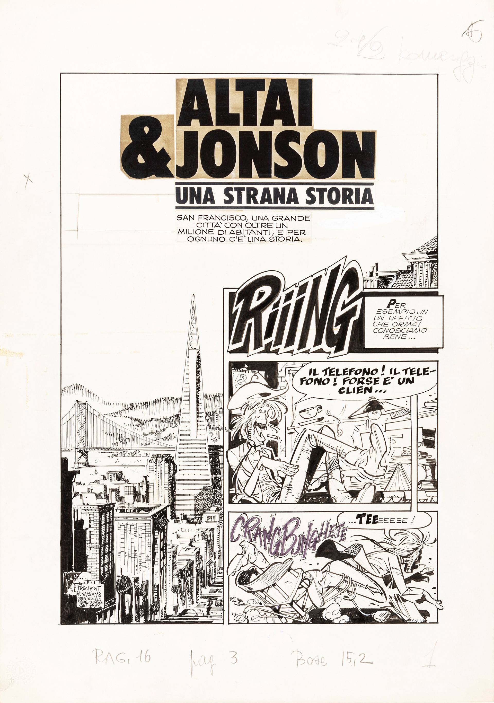 matita e china su cartoncino, 35 x 50 cm 1976 Title page originale realizzata da Cavazzano per Una strana storia, quattordicesimo episodio della mitica serie Altai & Jonson pubblicato sul CdR n. 16 nel 1976. Nati nel 1975 dal fervido genio di Tiziano Sclavi e dal magistrale pennello di Giorgio Cav