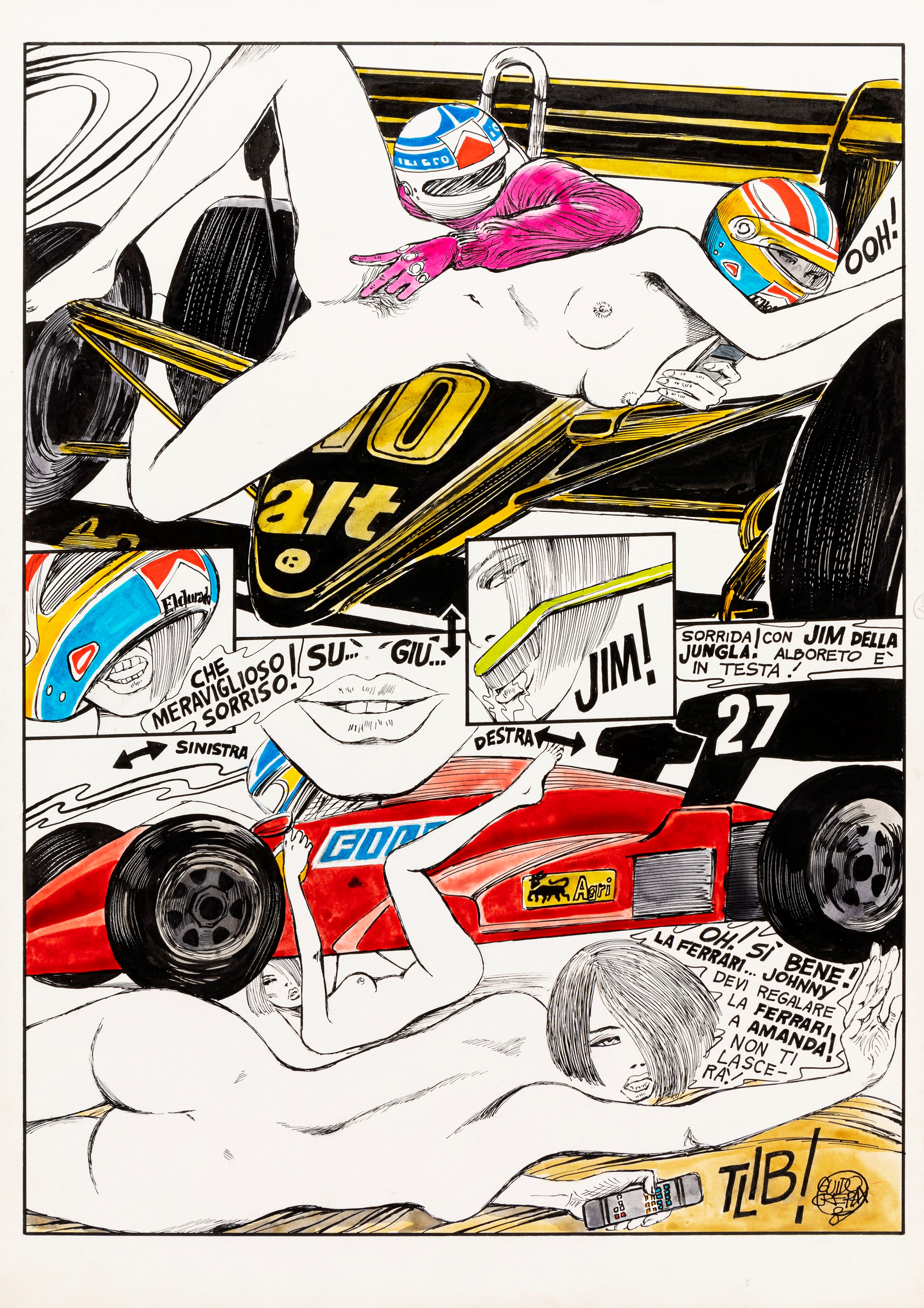 matita, china e acquerello su cartone, 36,5 x 51 cm 1987 Tavola originale realizzata da Crepax per Anita Color, edita per la prima volta a pag. 9 nel volume Anita in diretta dalla Olympia Press nel 1988. Crepax torna a raccontare l'ossessione di Anita per il televisore ma questa volta parliamo di un tv color e dell'intromissione di quell'oggetto demoniaco che è il telecomando, adatto a consentire la schizofrenica e maniacale attività dello zapping. Il continuo cambio di canale assicura alla protagonista la compagnia di campioni dello sport, divi cinematografici, personaggi storici e letterari e quant'altro trasmesso dalla TV. In questa tavola troviamo Valentina alle prese con il campione di Formula 1 Michele Alboreto. Firmata e datata.