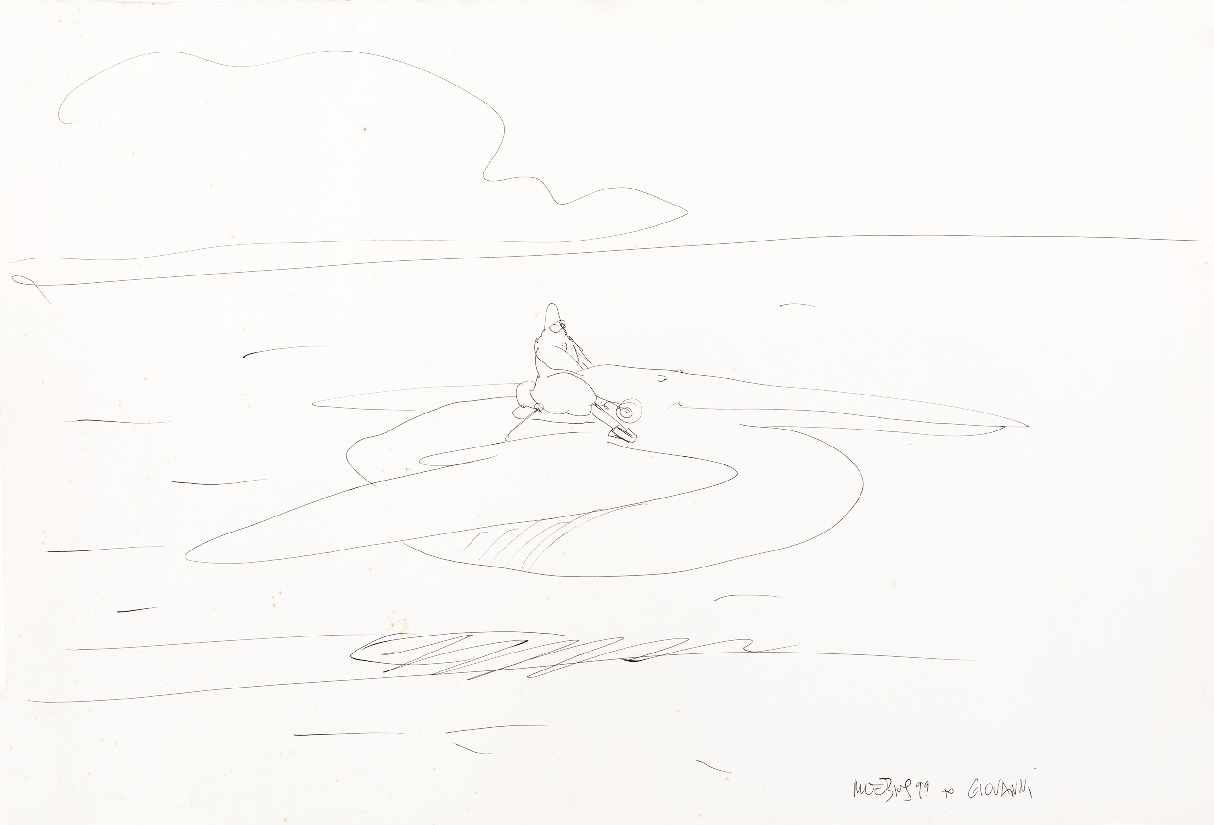 biro su cartoncino, 48 x 33 cm 1999 Sketch originale realizzato da Moebius e raffigurante il suo celeberrimo Arzach sul suo fido pterodattilo. La presente opera fu eseguita dal maestro francese durante l'Expocartoon di Roma del 1999. Lievi tracce di foxing. Firmata, datata e dedicata.