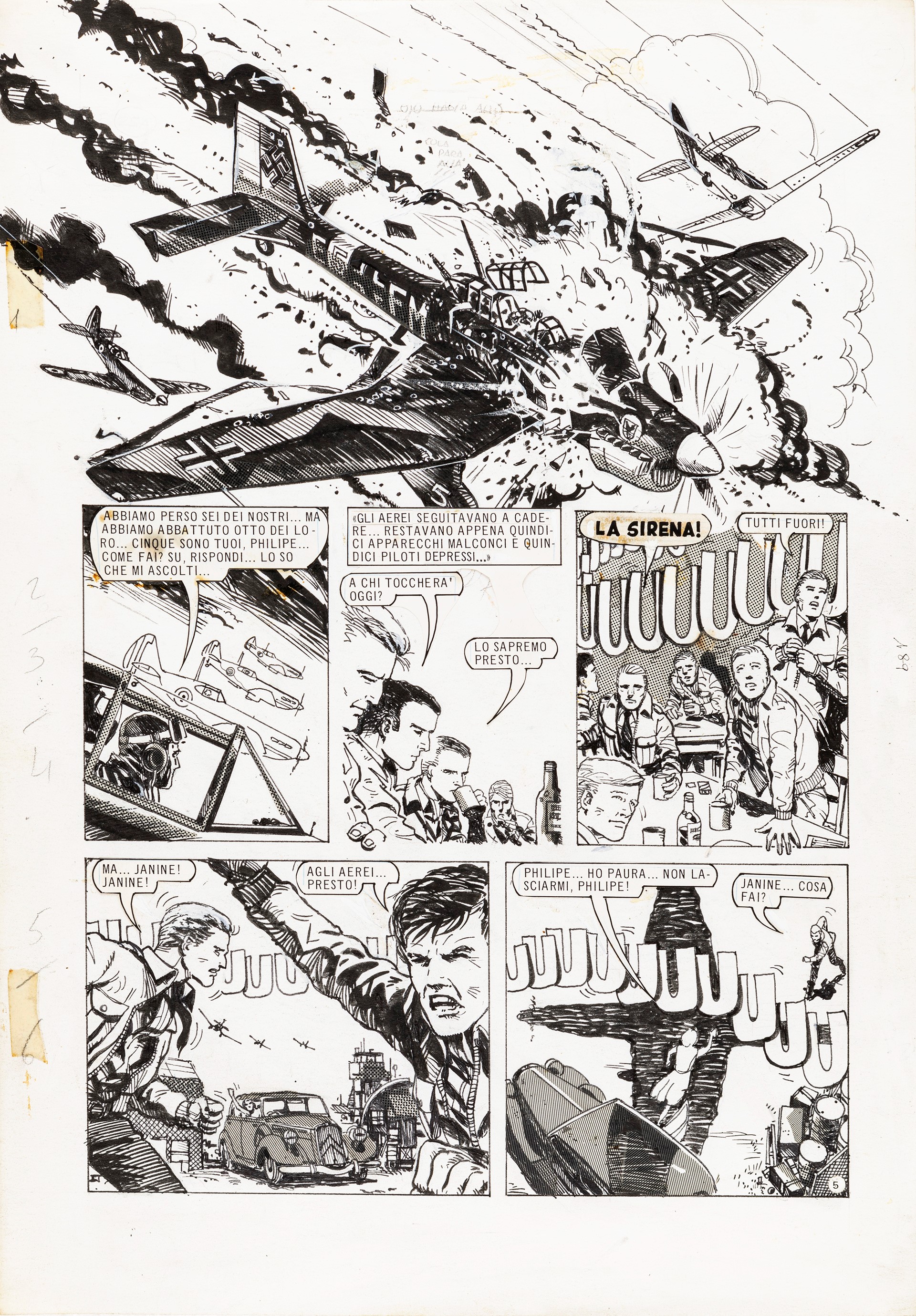 matita, china e retino su cartoncino, 30 x 43 cm 1977 Tavola originale realizzata da Giménez per Missione compiuta, page 5 del tredicesimo episodio della celebre saga di Asso di Picche, pubblicata per la prima volta in Argentina sulla rivista Skorpio n. 48 nel 1978.