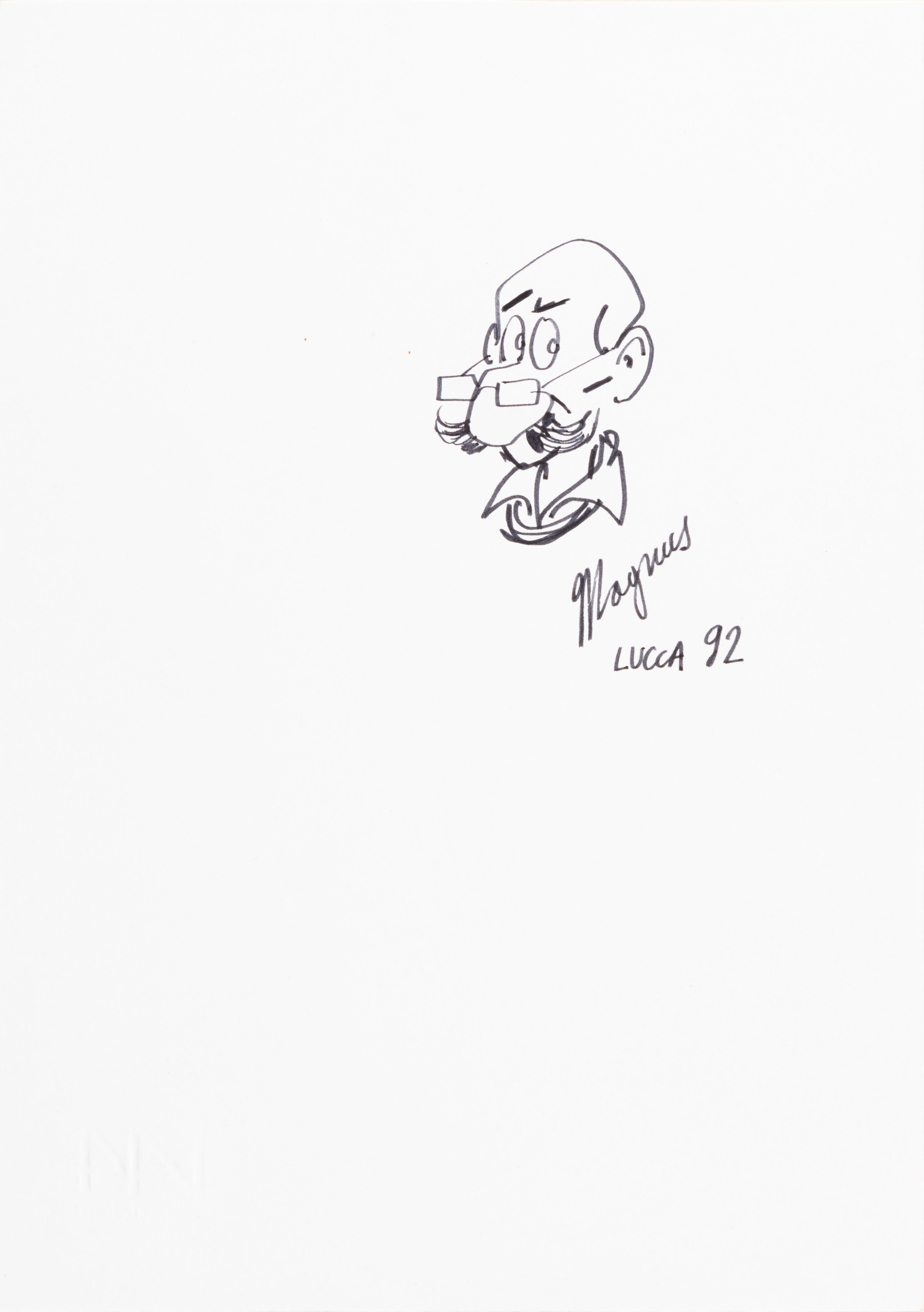 1992 Autoritratto originale realizzato da Magnus in occasione dell'edizione di Lucca Comics del 1990. Proveniente dalla collezione di Saverio Bruschini (tra i fondatori della manifestazione). Firmato e datato.