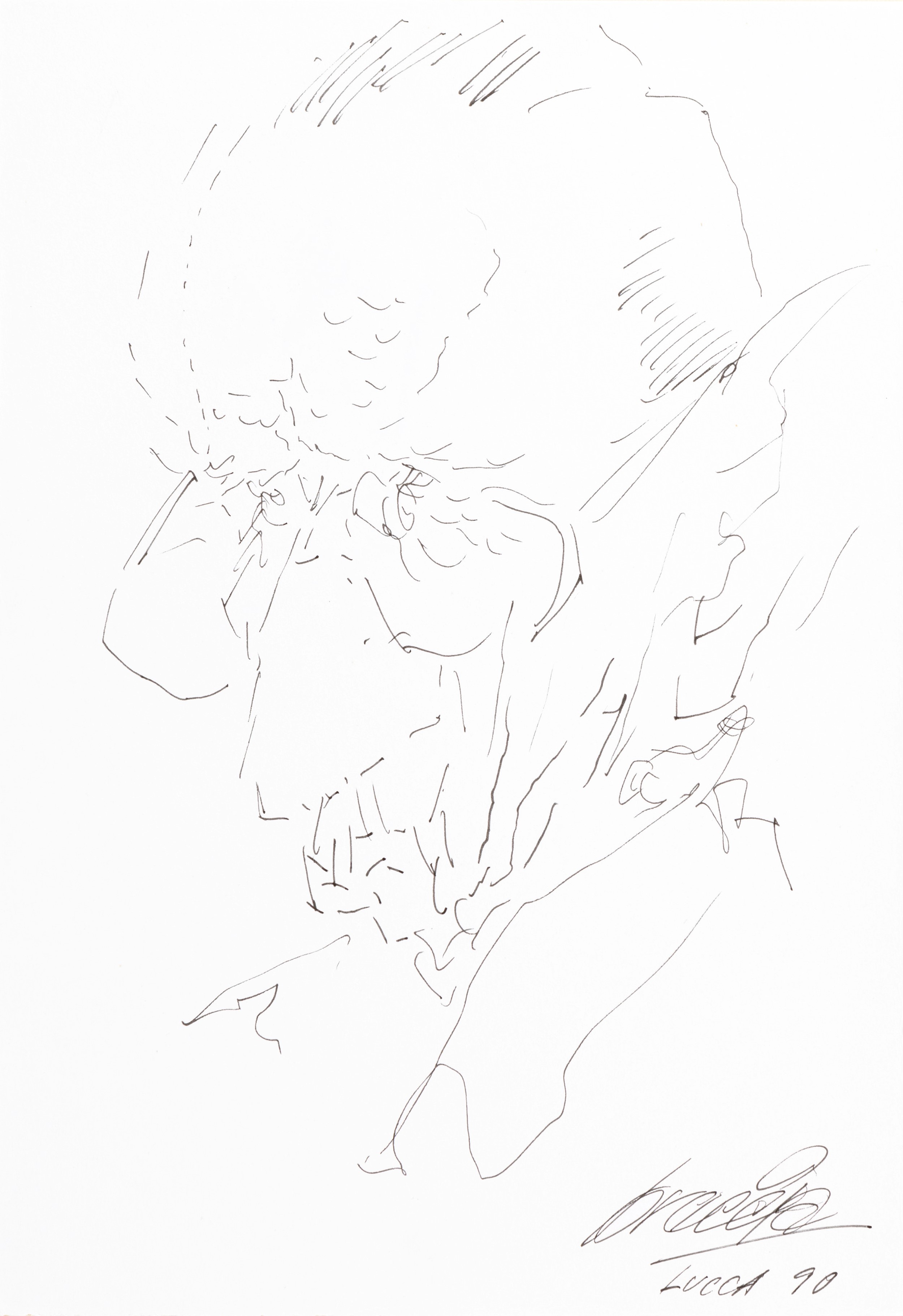 1990 Autoritratto originale realizzato da Breccia in occasione dell'edizione di Lucca Comics del 1990. Proveniente dalla collezione di Saverio Bruschini (tra i fondatori della manifestazione). Firmato e datato.